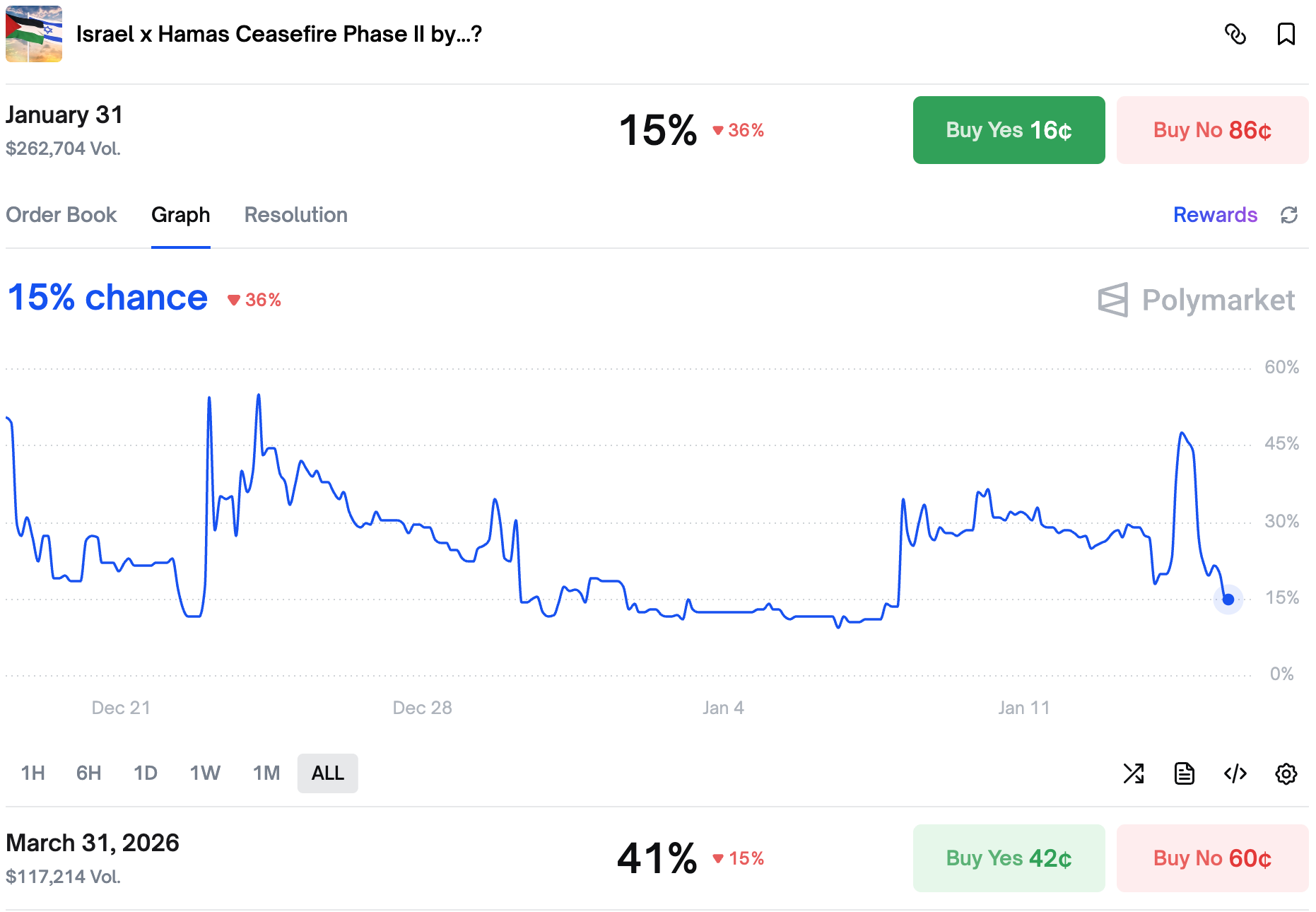 Traders initially sent the odds way higher, but then some sharps realized that the announcement doesn't meet the resolution criteria. It was not announced by both Israel and Hamas (yet). And it is not implemented, yet. Any of the two happen ,the market can resolve. But for now it seems that the Phase II of the Gaza ceasefire is a mirage ;)
