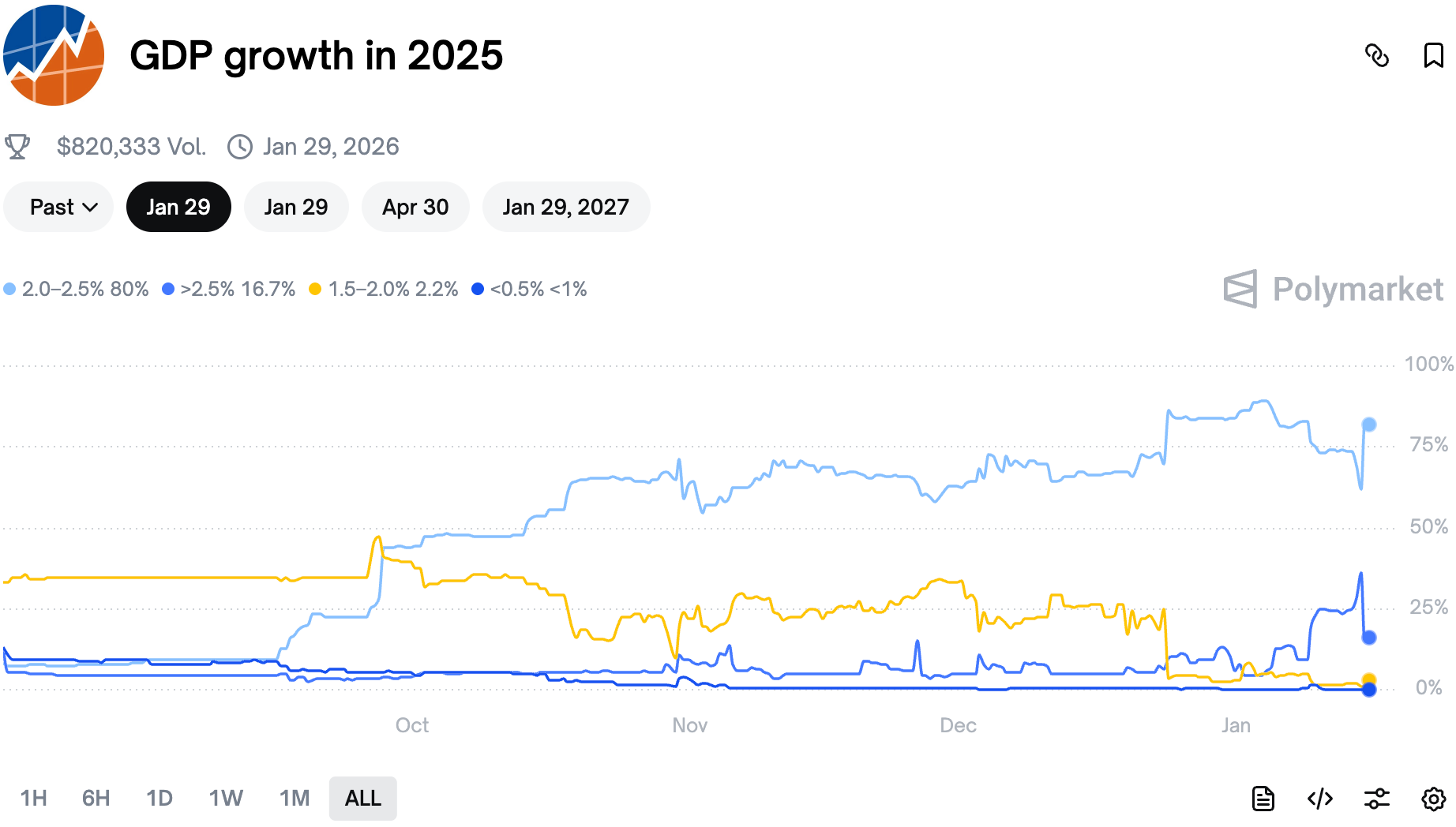 The highest bracket on the market started to rise after Atlanta Fed GDPNow estimate forecasted 5.3% GDP growth for Q4 2025. But the market is about the whole 2025, and estimation is more nuanced than taking an average of Q1-Q4 rates. We guess some traders are in for a surprise.