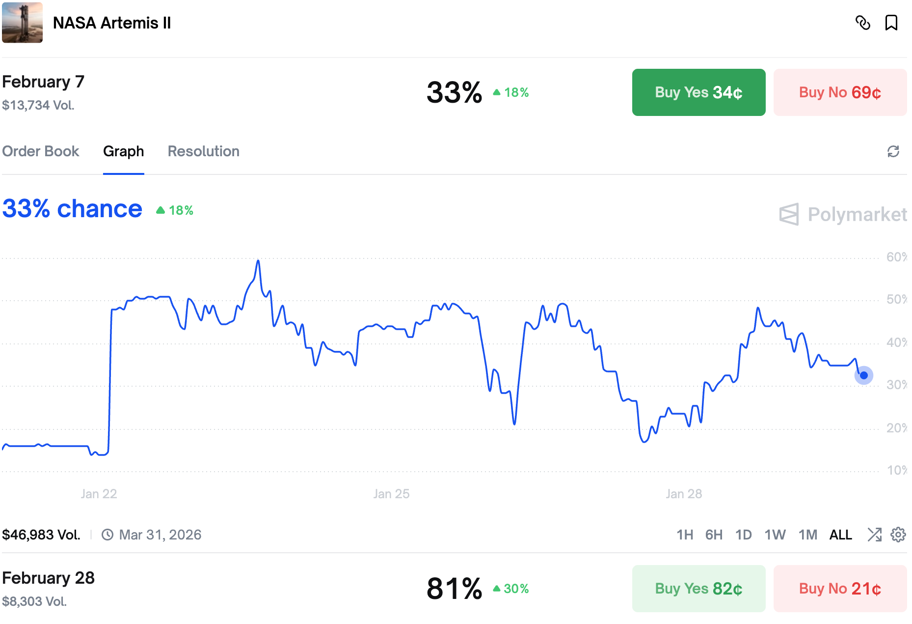 It took only one day to move from a coinflip to 1/3 chance we will see the Artemis launch by February 7th.