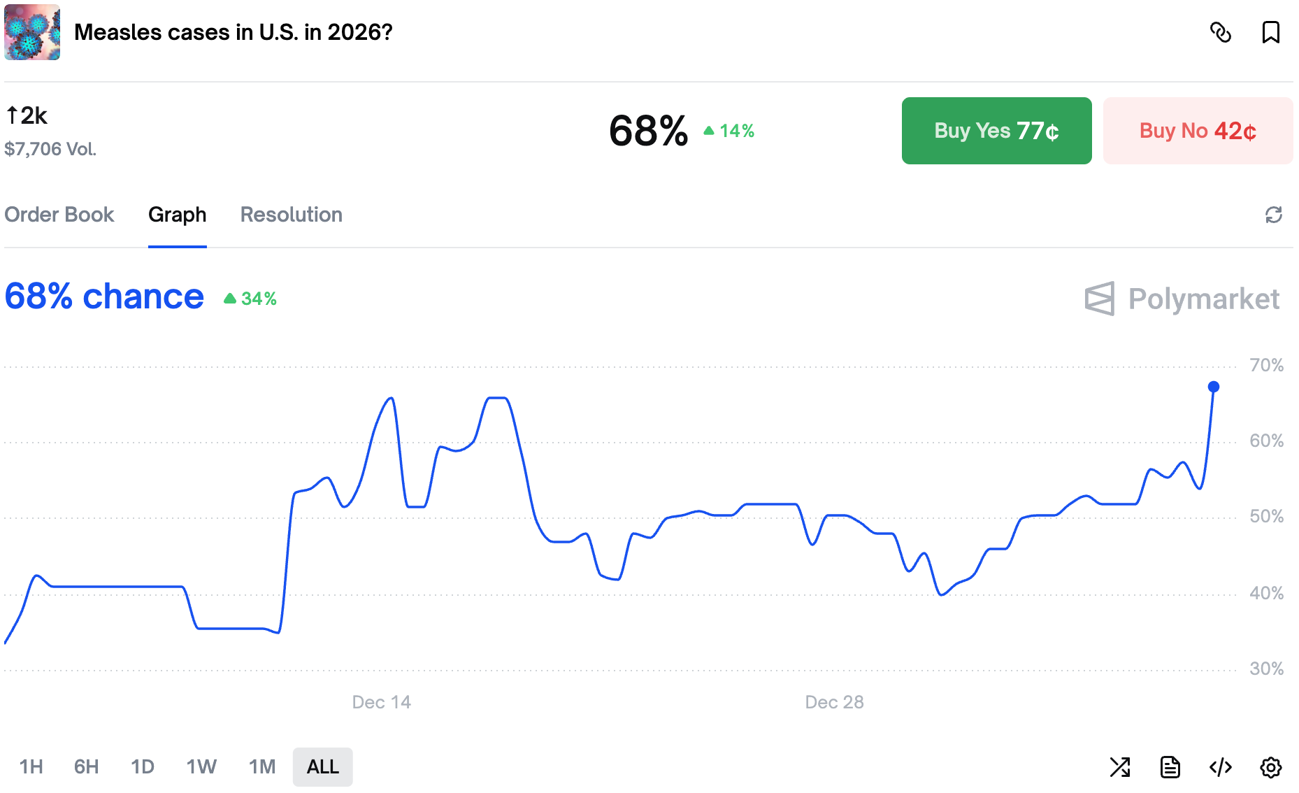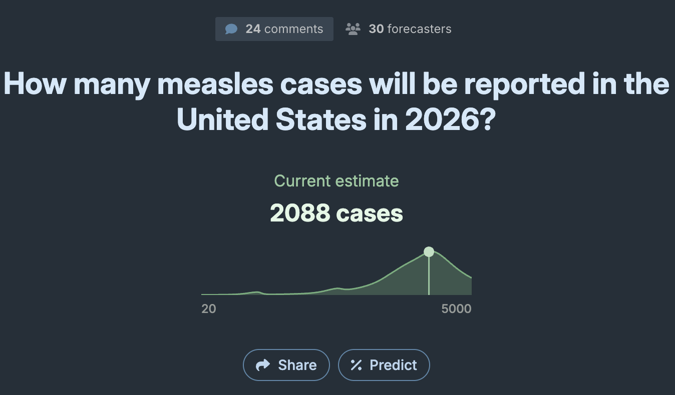 Currently both forecasters on Metaculus, as well as Polymarket traders see just above 2,000 cases as a base case for 2026. Last year though, the initial forecast was way lower than the final print - let's hope it's not the case this year.