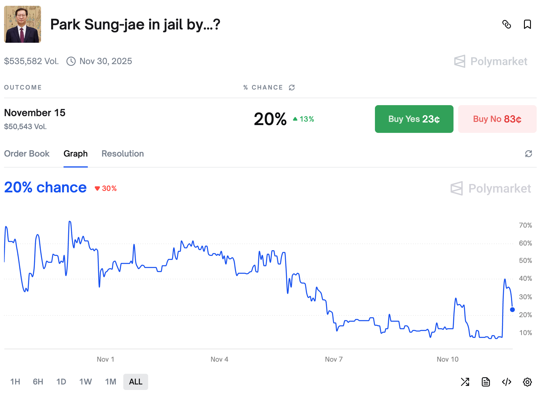 The odds of Park Sung-jae going to jail by November 15th surged briefly.
