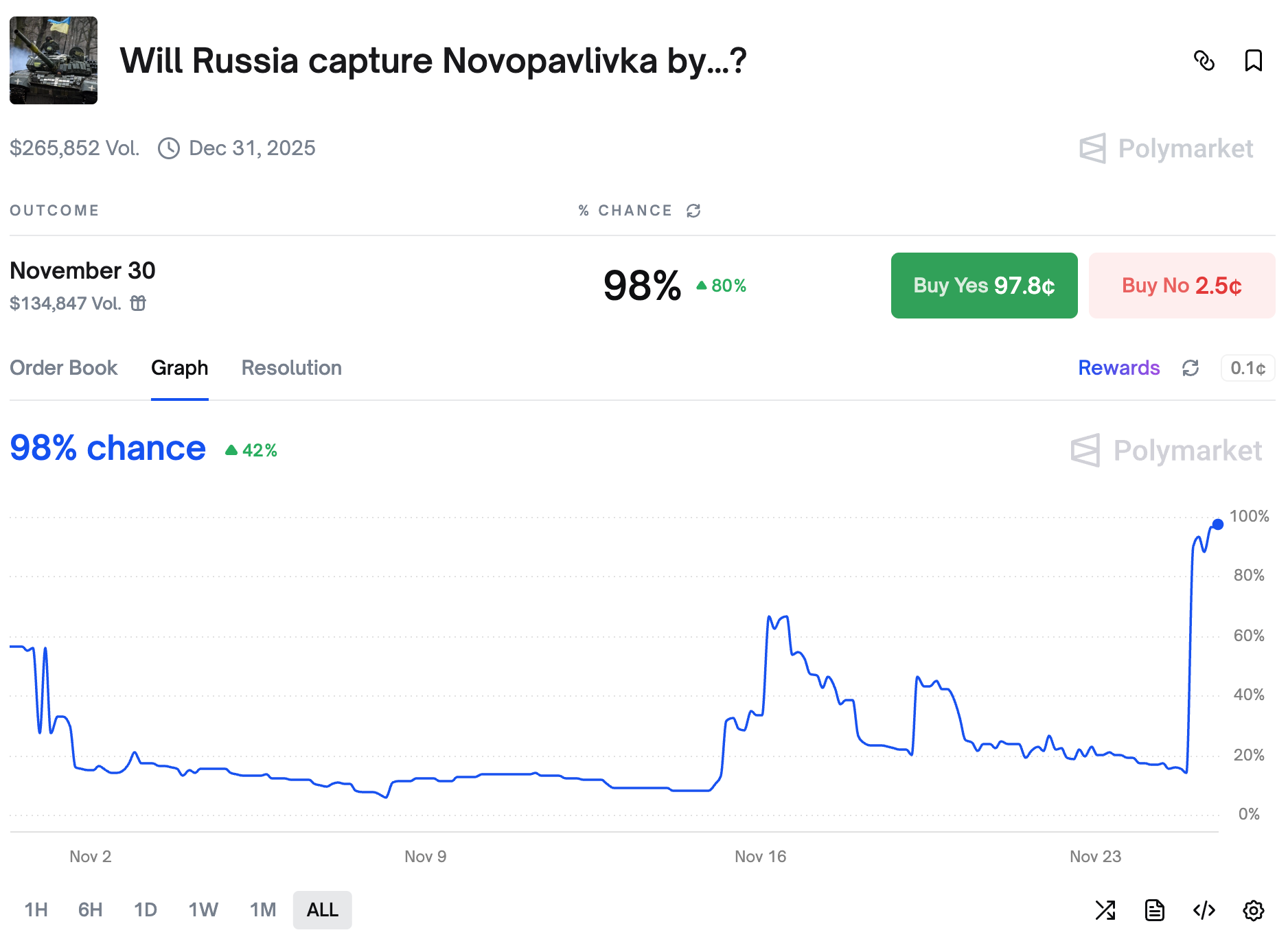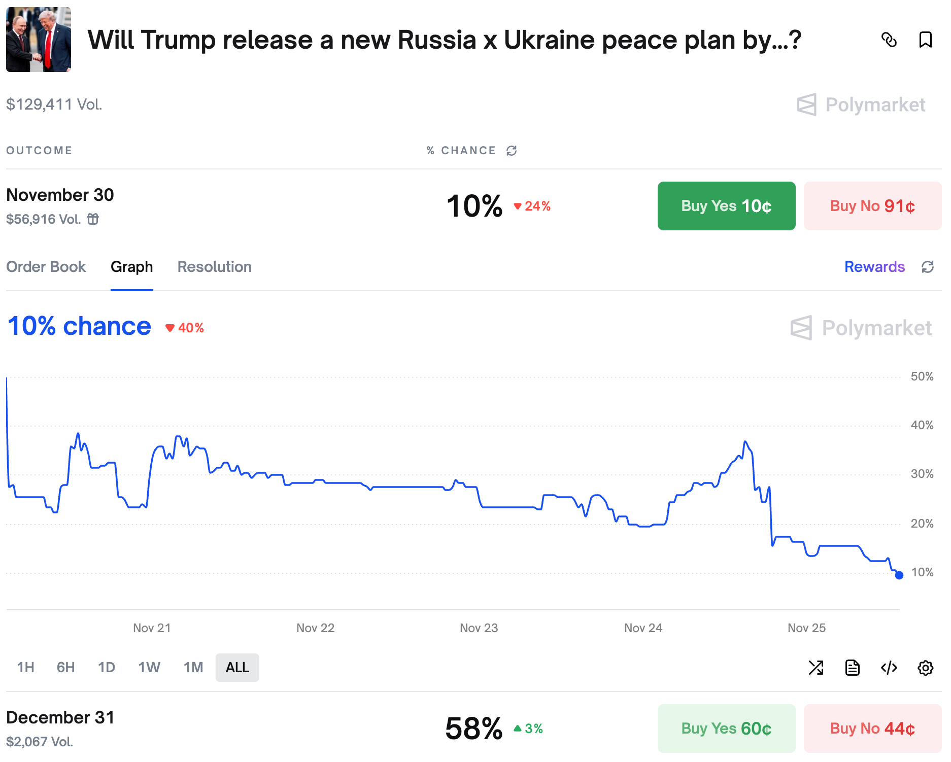 Traders are increasingly bearish on a new Ukraine peace plan being presented this month, and put only 58% chance to see it by the end of the year. After the 28-point plan drama, the US and Ukrainian delegations started to work on a new framework and all signs point to it being another nothingburger.