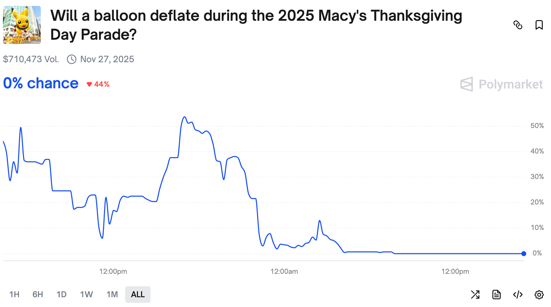 Despite traders assigning over 50% chance of a balloon deflating, ultimately the Macy's Thanksgiving parade went on without surprises.