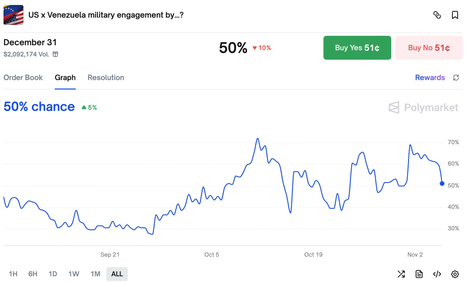Despite the announcement of another drug boat strike, the market on US military engagement in Venezuela by the end of the year dropped sharply.