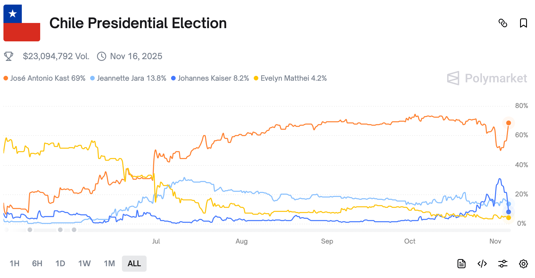 The first round is expected to be won by Jannette Jara from the Communist Party, however she is poised to lose against either of the two right-wing candidates in the second round. Traders initially trusted the AtlasIntel survey, however after it didn't prove to be right in the NYC mayoral election, they once again backed Kast.
