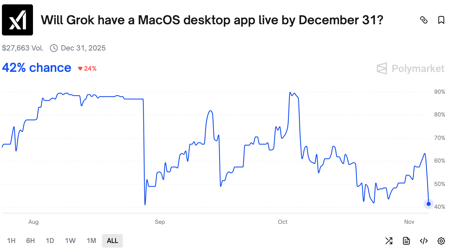 Elon Musk announced the upcoming desktop app back in February. However Elon Musk is known to overpromise and underdeliver when it comes to timelines. It's a bit shocking that it took so long for the chances to drop below 50%.