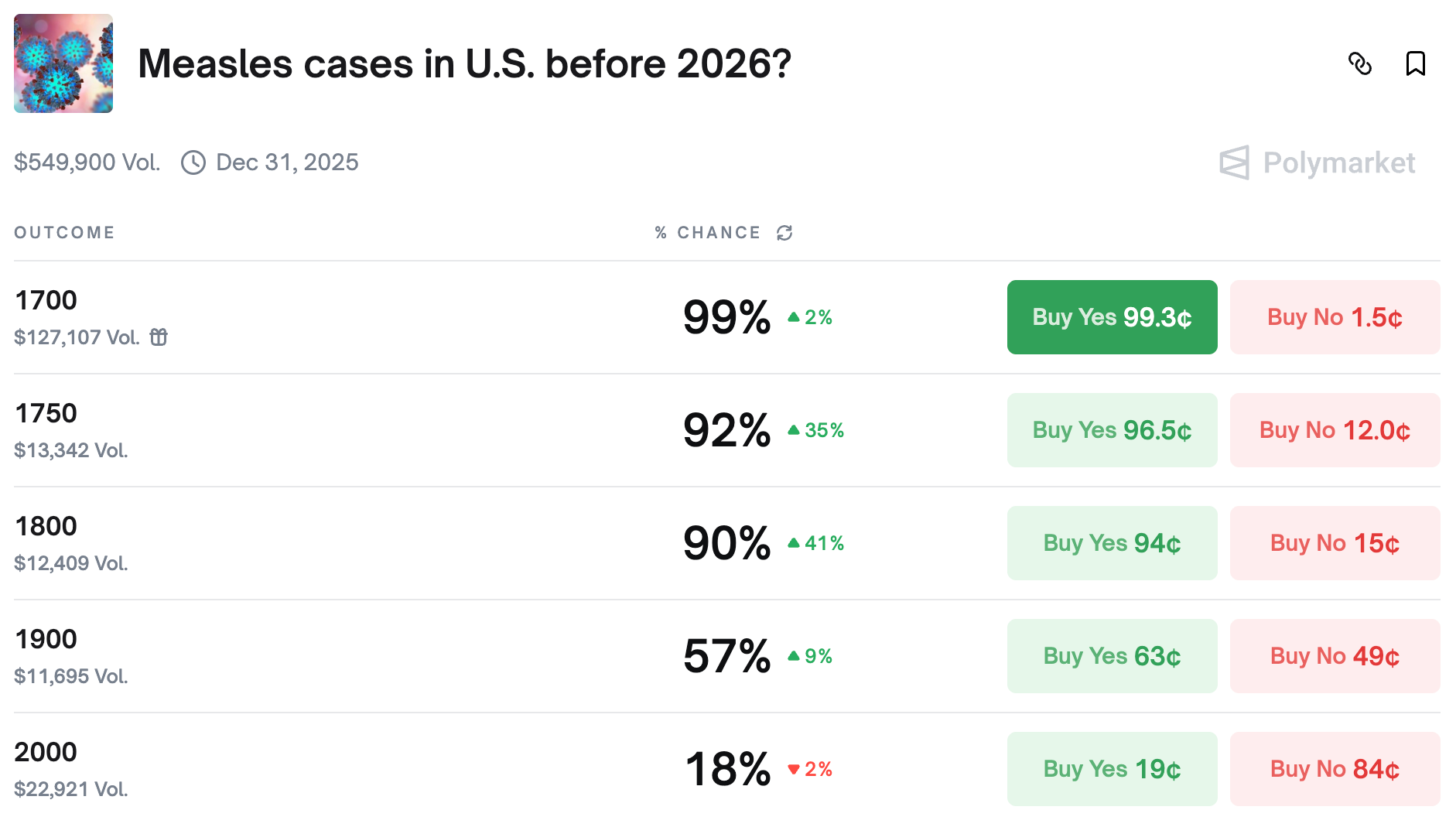 Traders are now almost certain to see at least 1,800 measles cases in the US by the end of the year.