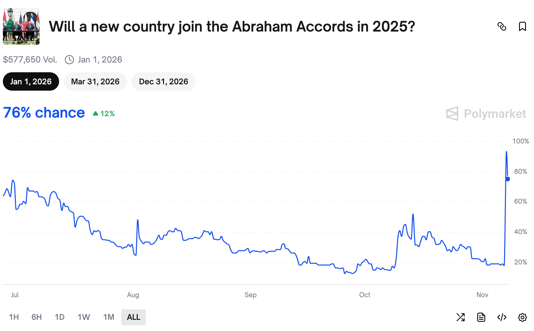 It looks like a new country is joining Abraham Accords after the chances spiked to almost 100% on the market.