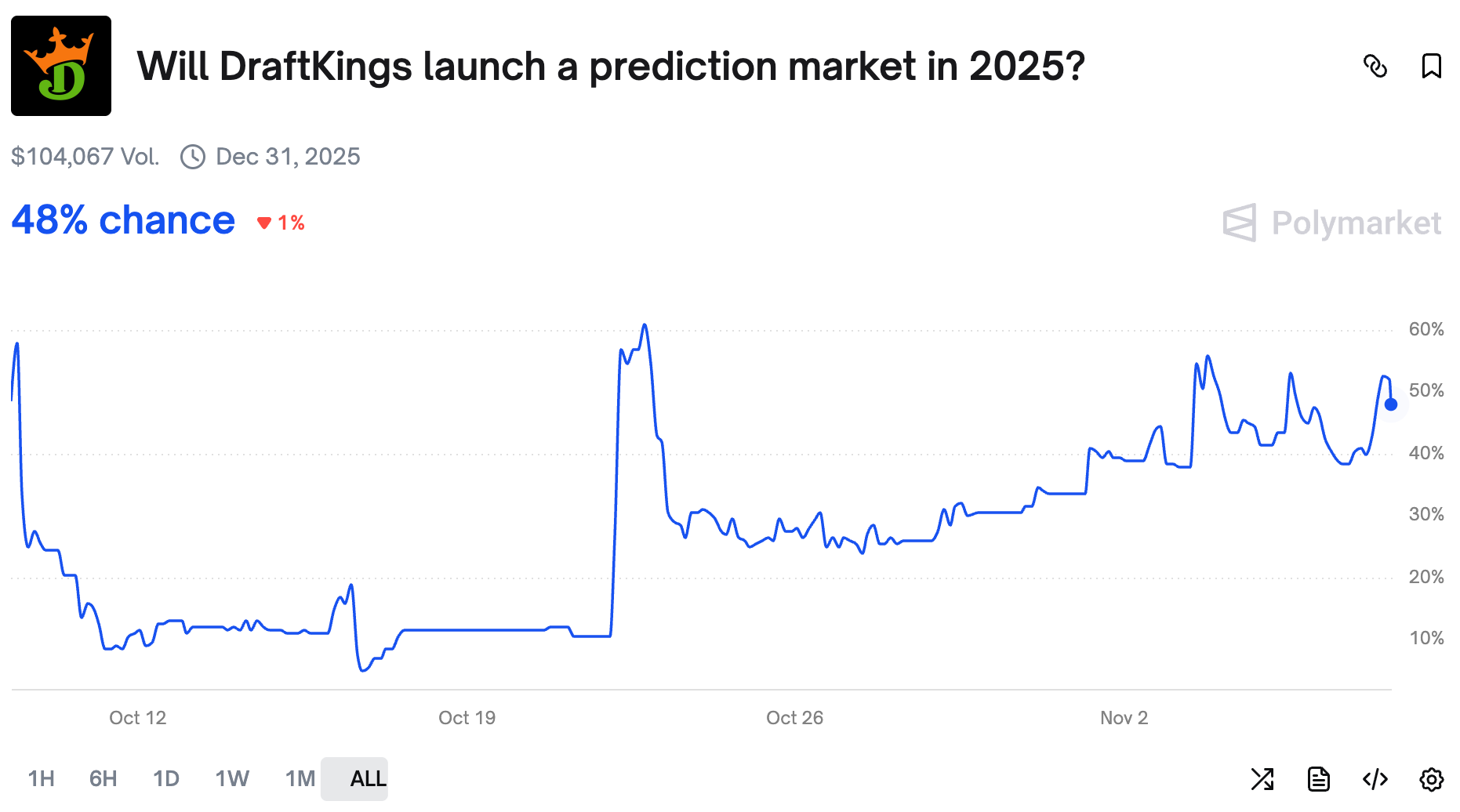 The October spike you see was related to DraftKings acquiring RailBrid, a niche prediction market platform. Now the company lowered it's end of year financial outlook citing costs associated with launching a prediction market platform as key reason. However the government shutdown is surely making it difficult to coordinate with CFTC and is one of the reasons behind the odds not surging higher as the end of the year looms closer.