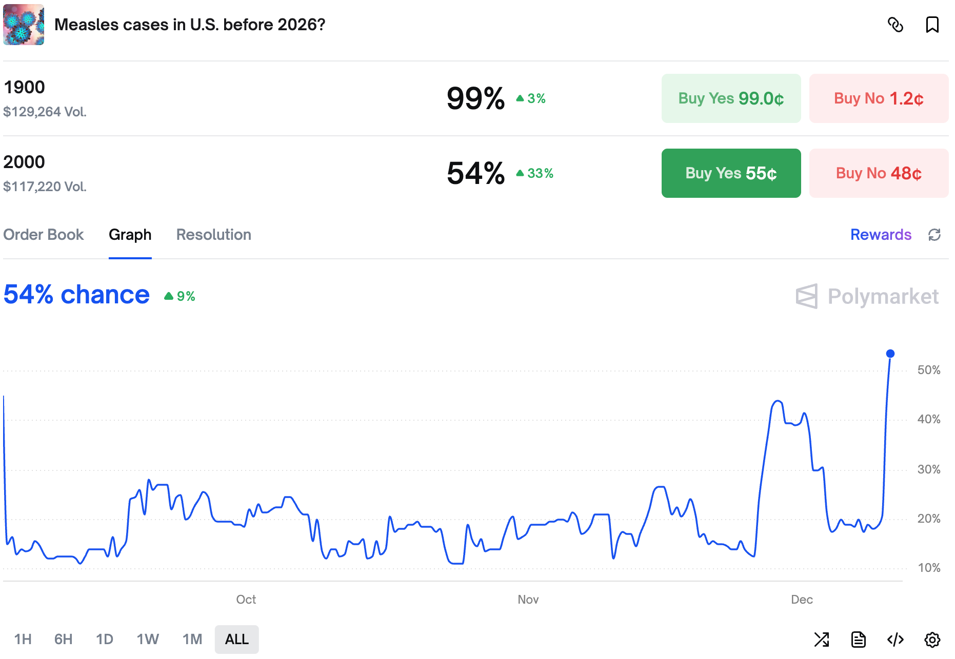 After a brief spike a week ago, traders are once again pricing the chance for over 2,000 measles cases like a coinflip.