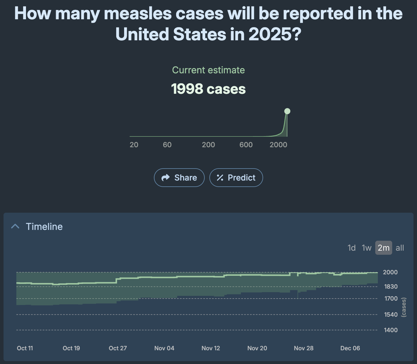 The recent trajectory of cases will put the total for 2025 awfully close to 2,000 threshold. Metaculus is currently forecasting 1,998 cases with forecasters commenting that they are almost equally split between just below and just above the 2,000 threshold.