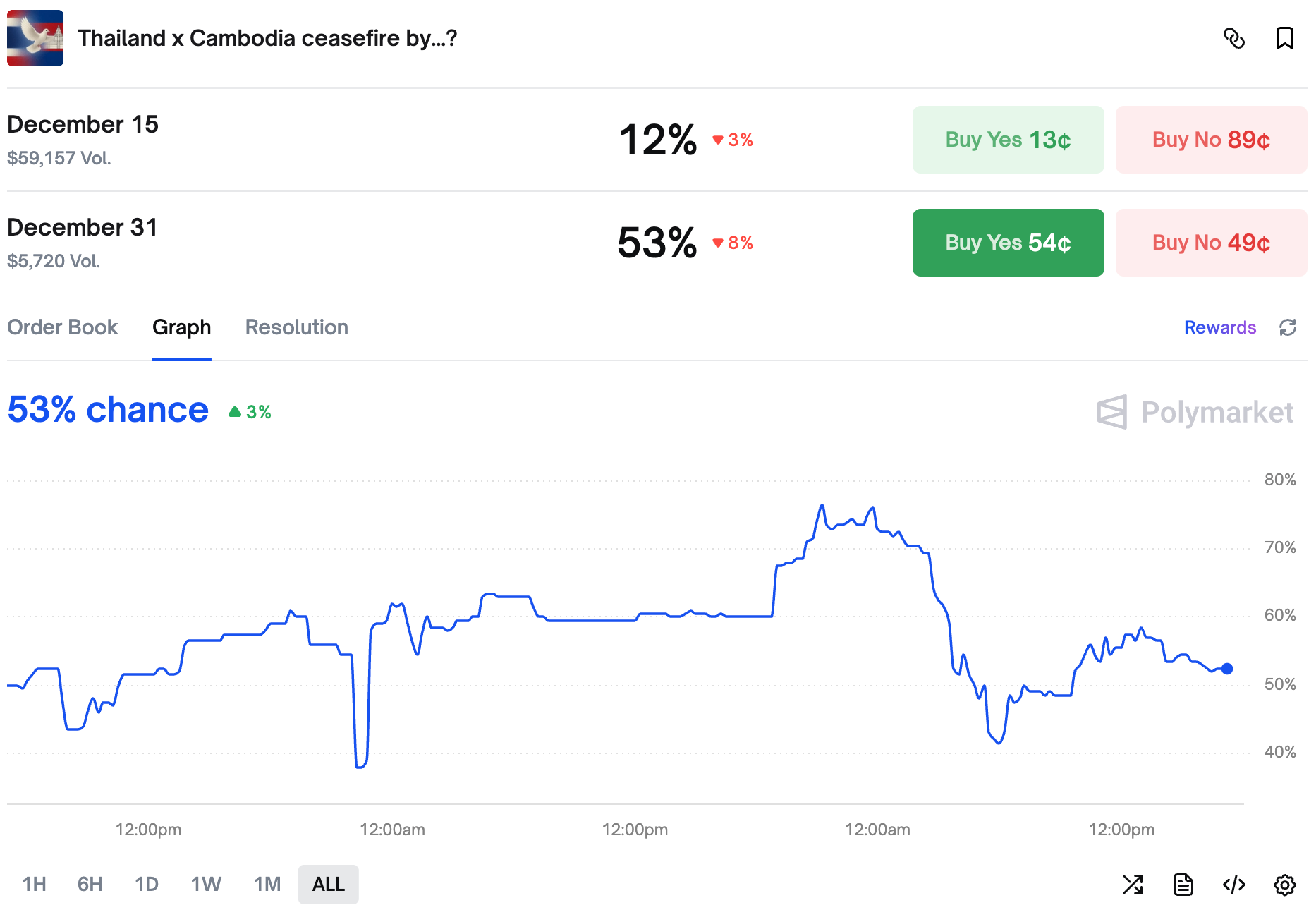 We are talking about Thailand and Cambodia, who started renewed fighting (look for other articles on this website for more context). And this time traders are not confident we will see a ceasefire soon. With both countries' postures suggesting a prolonged fight, we have only 53% chance of a ceasefire this year.