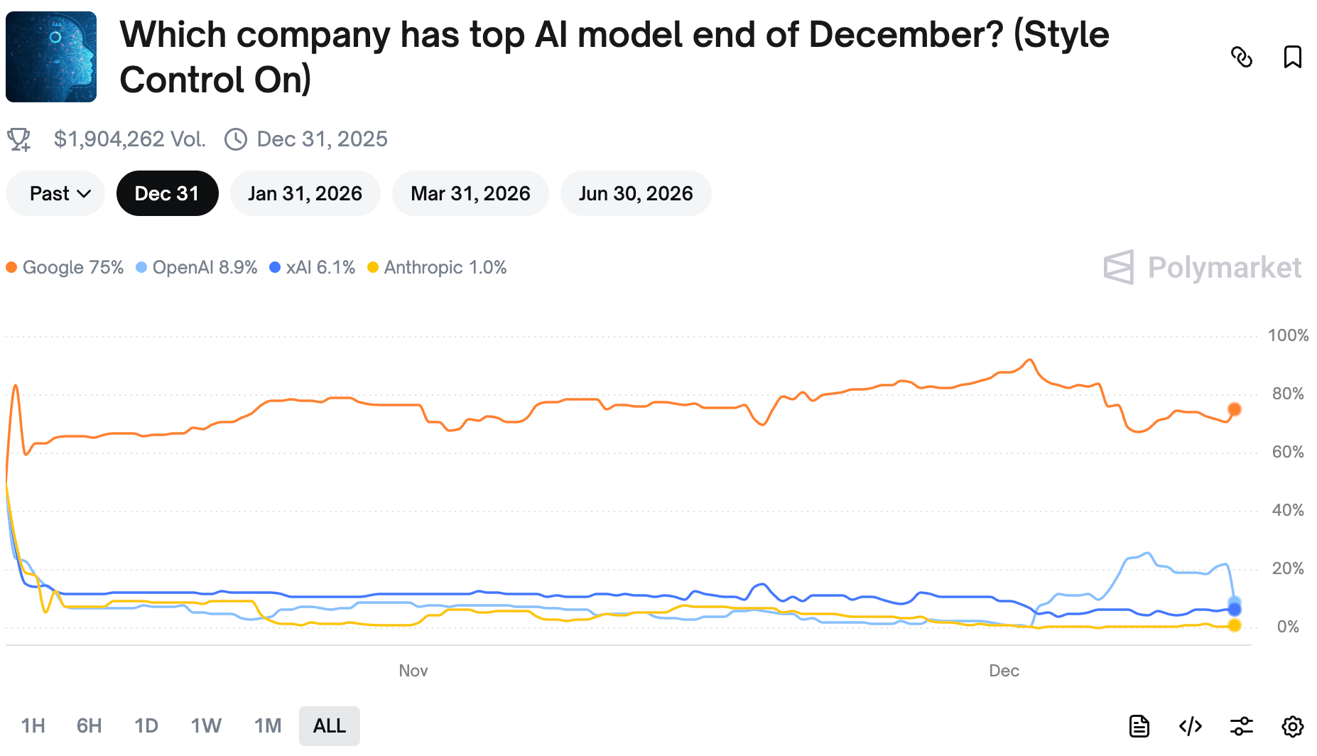 Traders weren't particularly betting on OpenAI to jump ahead, giving it only 20% chance, but it seems that expectations were higher for the new model to perform around coding and maths - the main moves are in the math and coding markets. Funnily though, that's where Anthropic - not Google - is the leader.