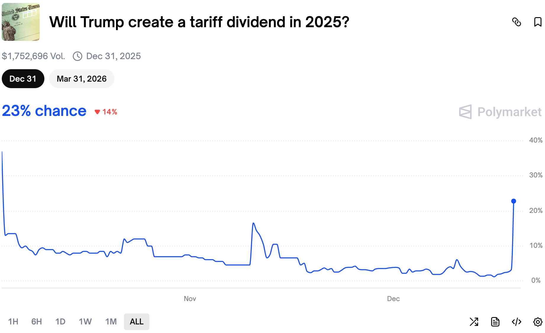 The odds of a tariff dividend being created in 2025 rose sharply after Trump announced a warrior dividend of $1,776 for all military personnel.
