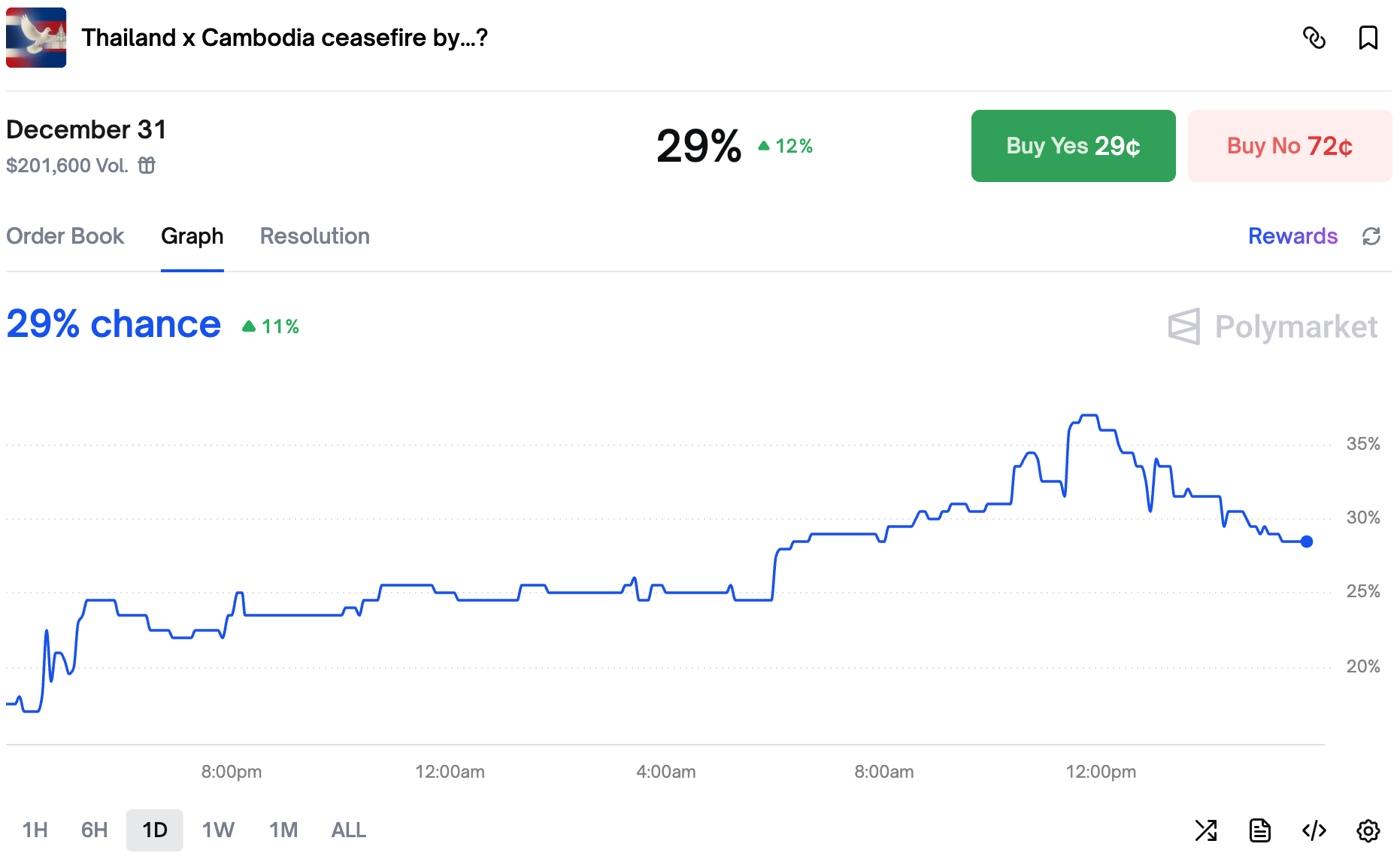 After a brief bullish streak, the chances of a ceasefire between Thailand and Cambodia slumped below 30%.