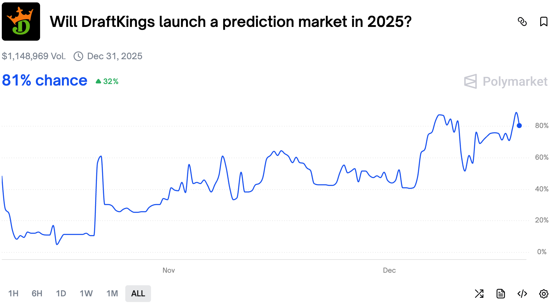 Despite only 13 days left in the year, traders are piling in on Yes shares on the DraftKings to launch a prediction market in 2025.