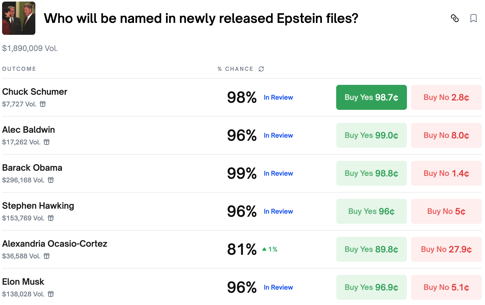 Only yesterday we highlighted these markets, only to show them resolved today. The DOJ published a second drop of the files, pushing a flurry of markets to resolve as several prominent people are named there, Elon Musk, Barack Obama and Alec Baldwin among them.