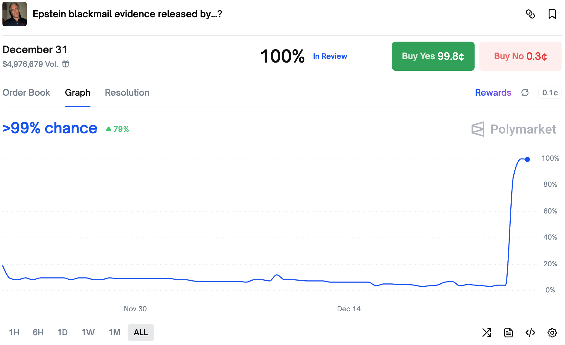 In a shocking reversal, Yes jumped from 3.4c to 100c per share as traders found that Epstein's lawyers blackmailed some victim.