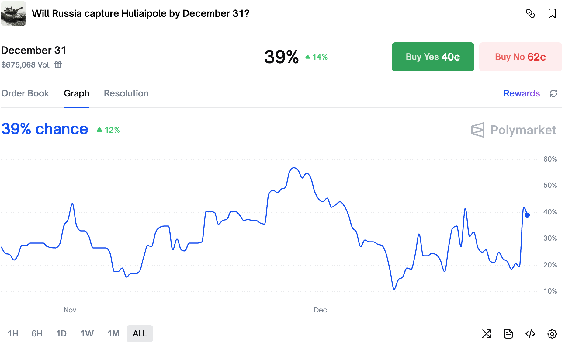 The ISW map (resolution source) is still showing Russians some 350 yards away from capturing the key intersection to resolve the market, but these are known to be updated with a lag. Traders must expect that the changes in the next 4 days will reflect the supposed reality on the ground.