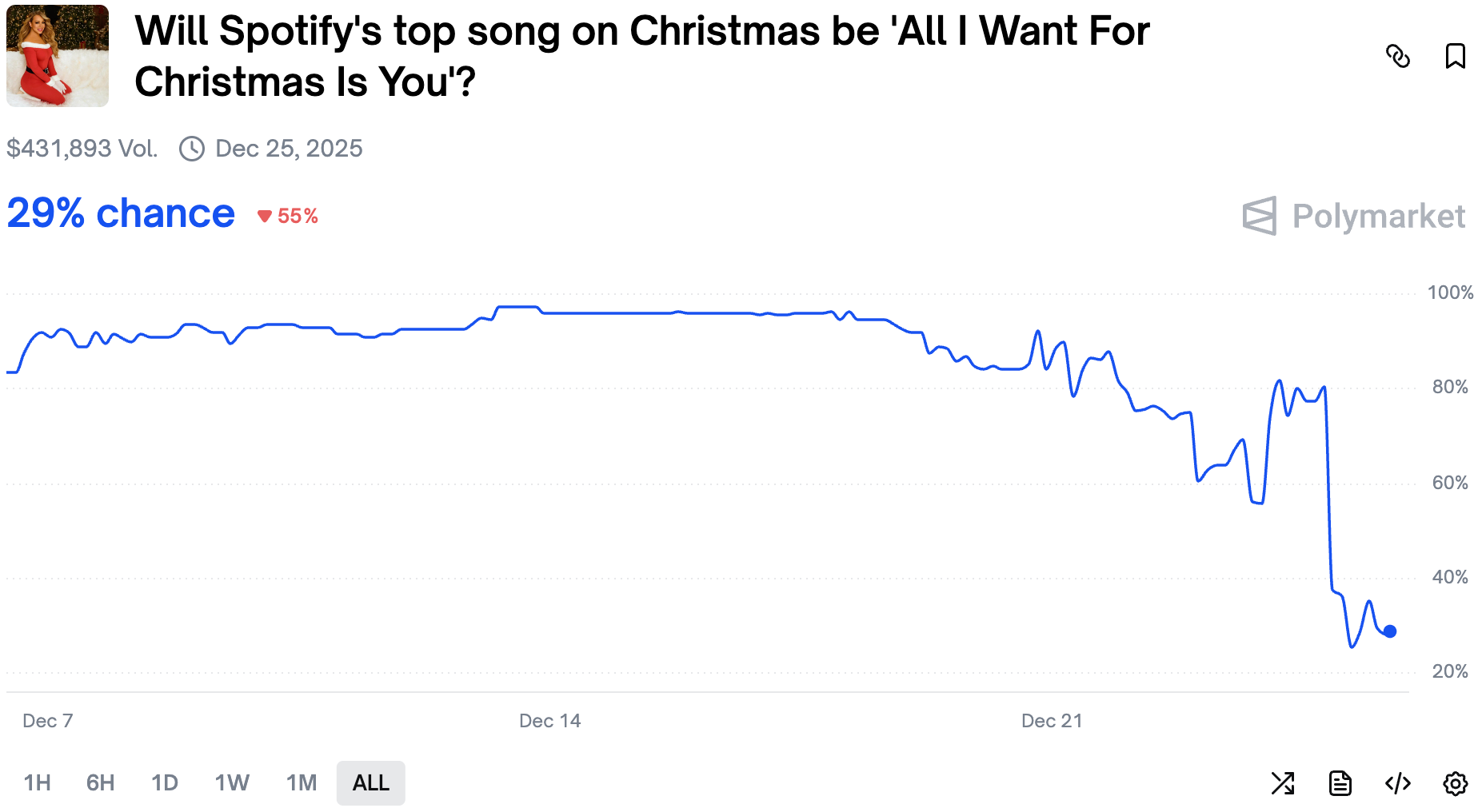 In a surprising turn of events traders are no longer confident Mariah Carey will have the top song on Christmas.