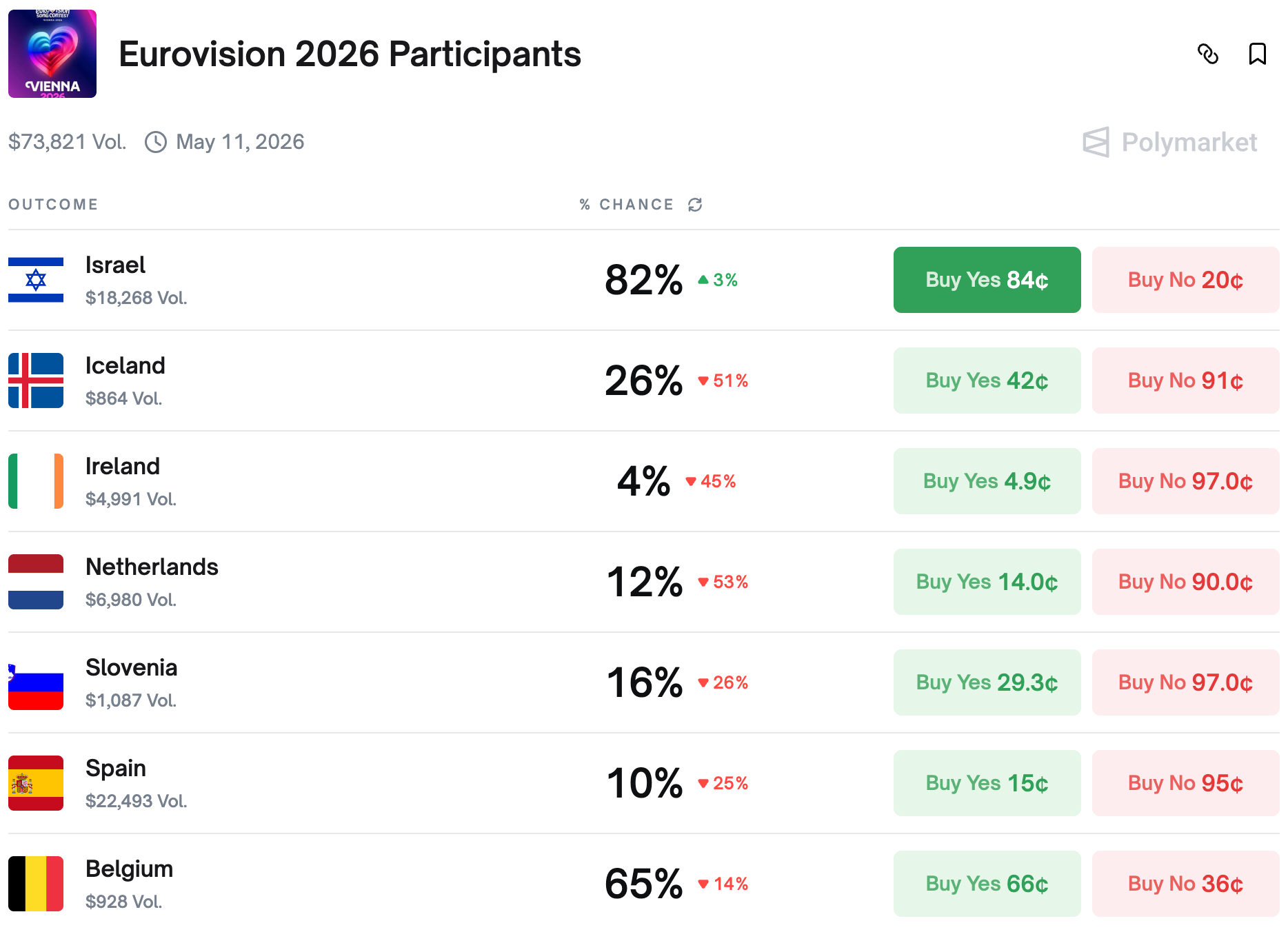 Traders adjusted the participation odds sharply as Ireland, Netherlands and Spain declared they won't participate in the contest next year. Boycotts come due to Israel being allowed to compete. And European countries seem to believe boycotting a musical festival is enough political pressure to change something.