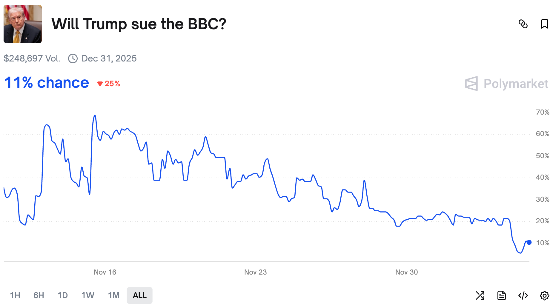 As Trump remains busy with international affairs, traders are increasingly bearish on him suing the BBC