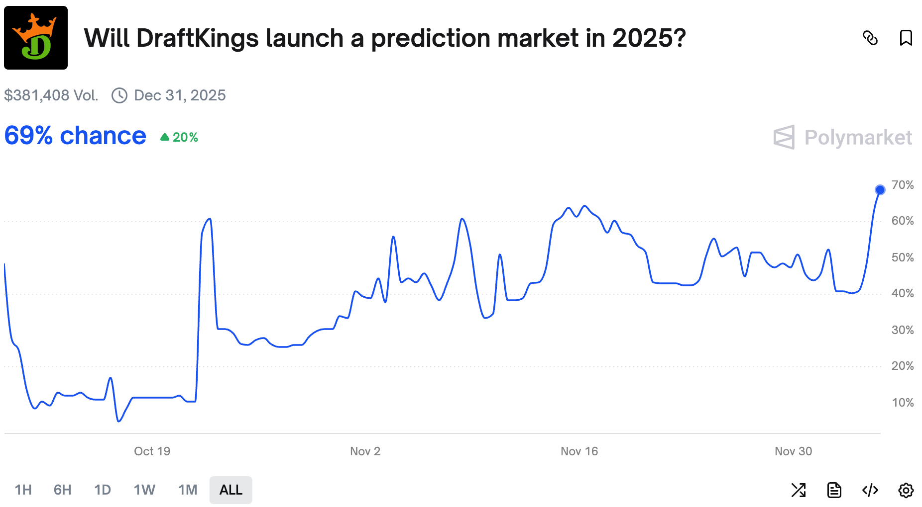 DraftKings remains behind the competition as several big players in the gaming industry have already launched their versions of prediction markets. After a weak Q3 and a constant pressure from out favorite new players (Polymarket & Kalshi), some traders believe the company will scramble to launch its own platform as soon as possible.