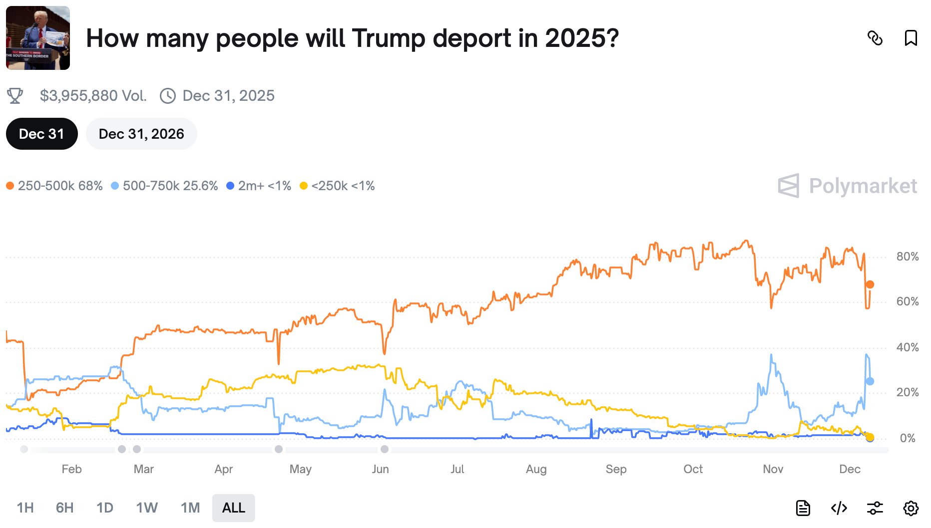 However, the market should resolve based on the numbers for the 2025 fiscal year for the US, which ended on September 30th. The consensus for that number is around 350,000 deportations - buying opportunity?
