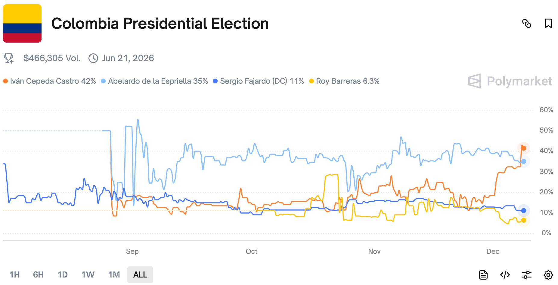 Traders are now putting Ivan Castro (guess his politics by surname ;) ) as the frontrunner in the Colombia Presidential Election.