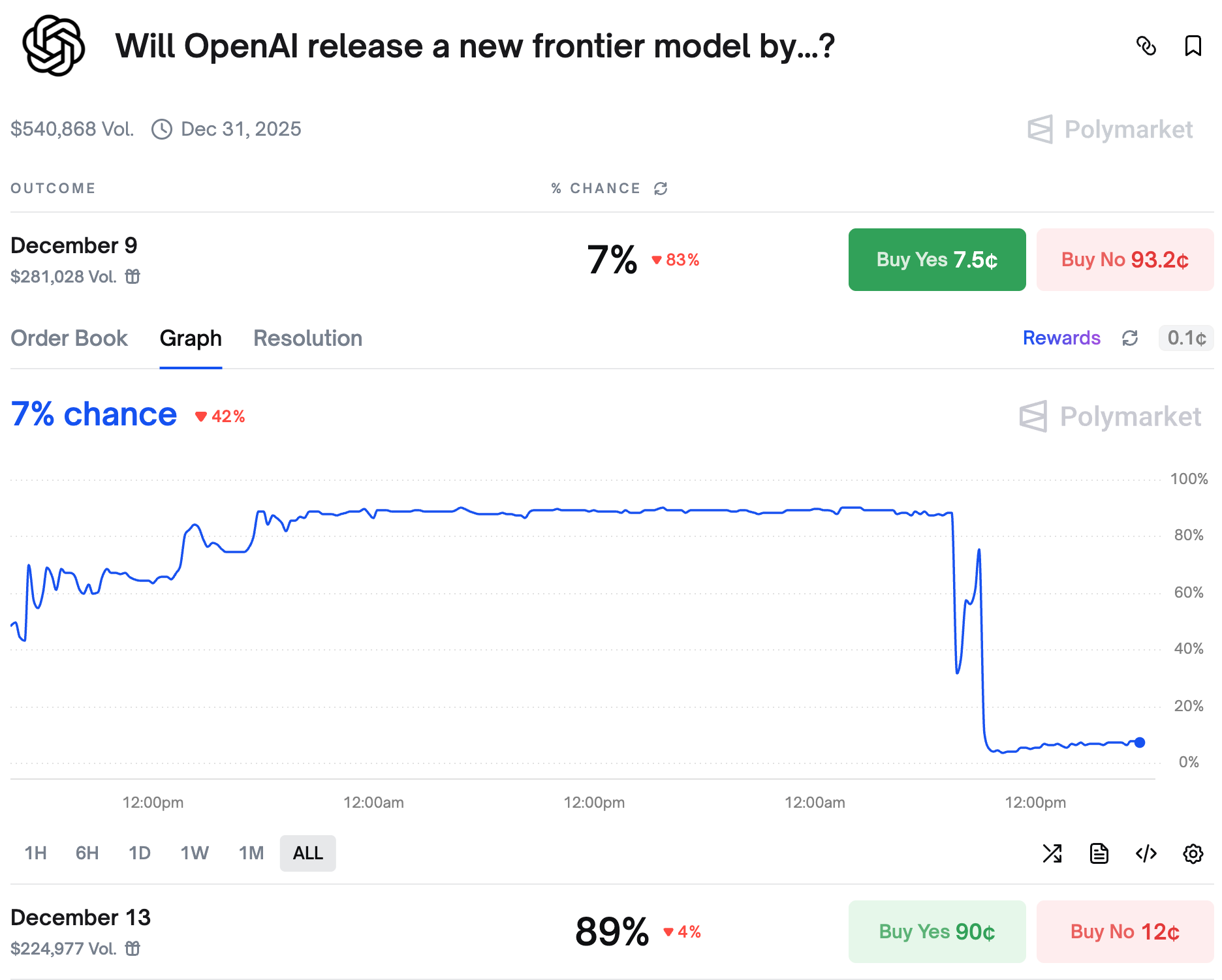 Recently such markets are prone to seeing insider activity, which brings aggressive price action. Price was high on the December 9th market due to reports of OpenAI wanting to counter the Gemini 3 launch. However it looks like we might get a slight delay if the person dumping the shares is really the insider - we'll learn soon enough.