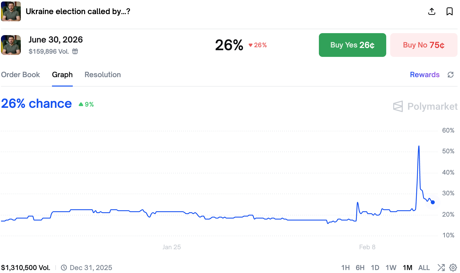 Yesterday FT reported that Zelensky is pressured to do an election and a referendum by May 15th, causing the chances to spike on the market; only hours later Zelensky denied everything, tempering the market's expectations.