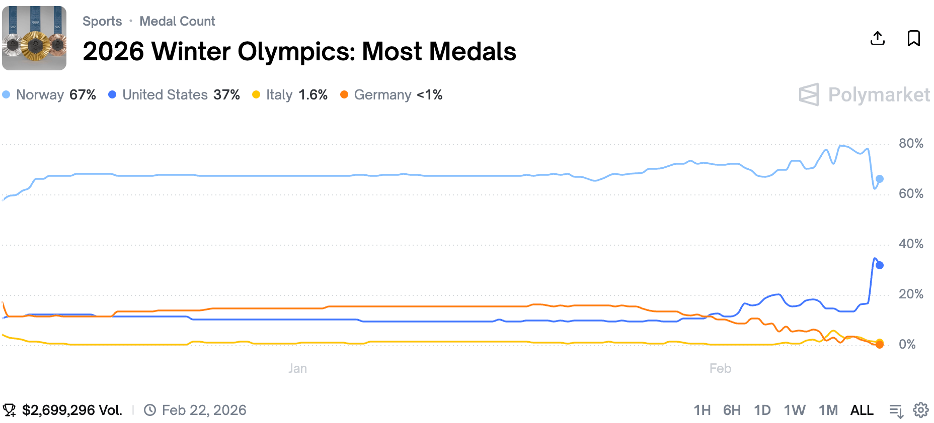Traders dramatically updated their fair values after Norway touched 80% chance as the table now looks wide open. That being said, Norway has one of the best teams when it comes to winter sports and the country has won 2 previous Winter Olympic Games.