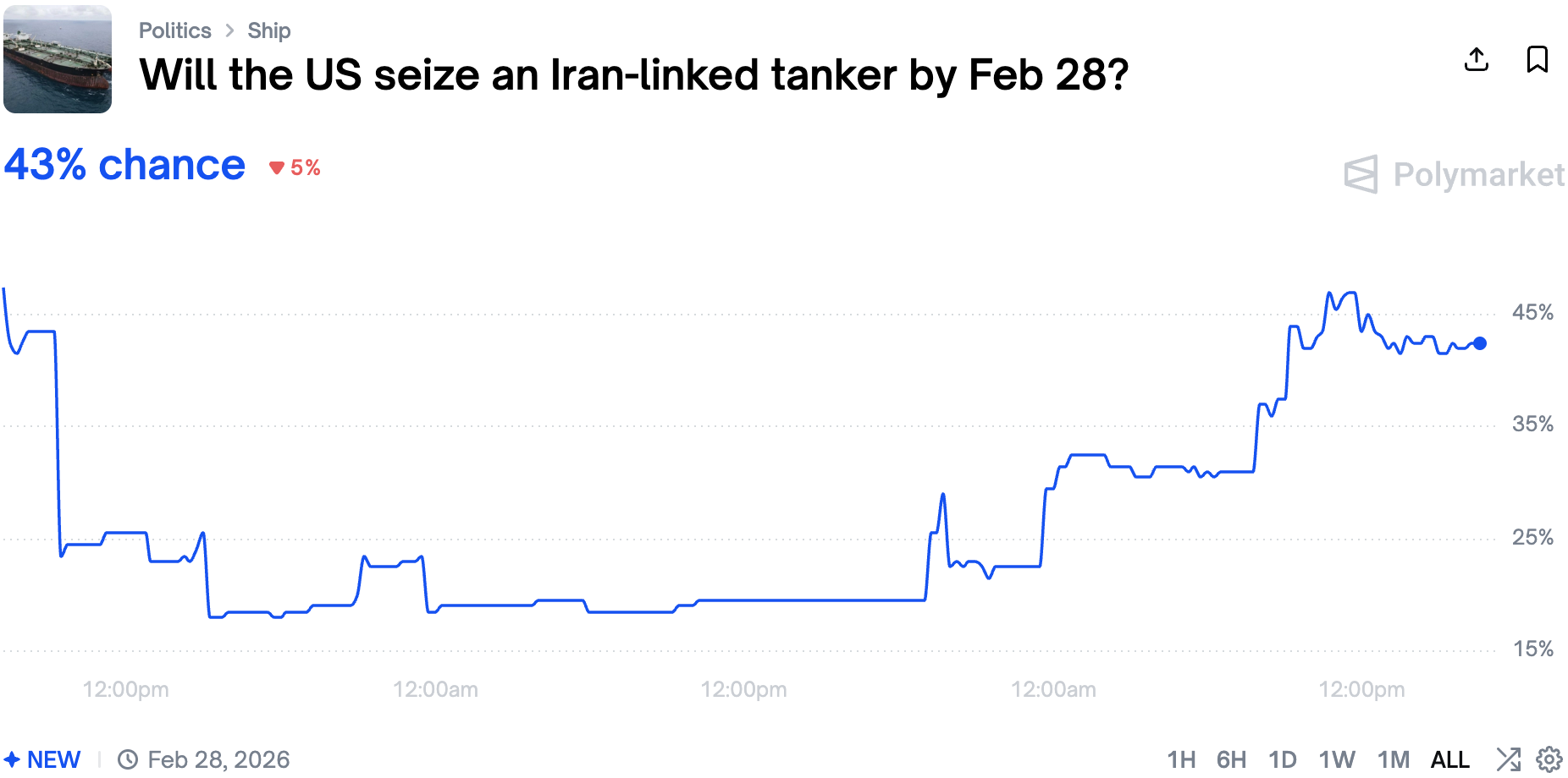 After successfully deploying a naval blockade on Venezuela, the market increased the chances of a tanker seizure near Iran.