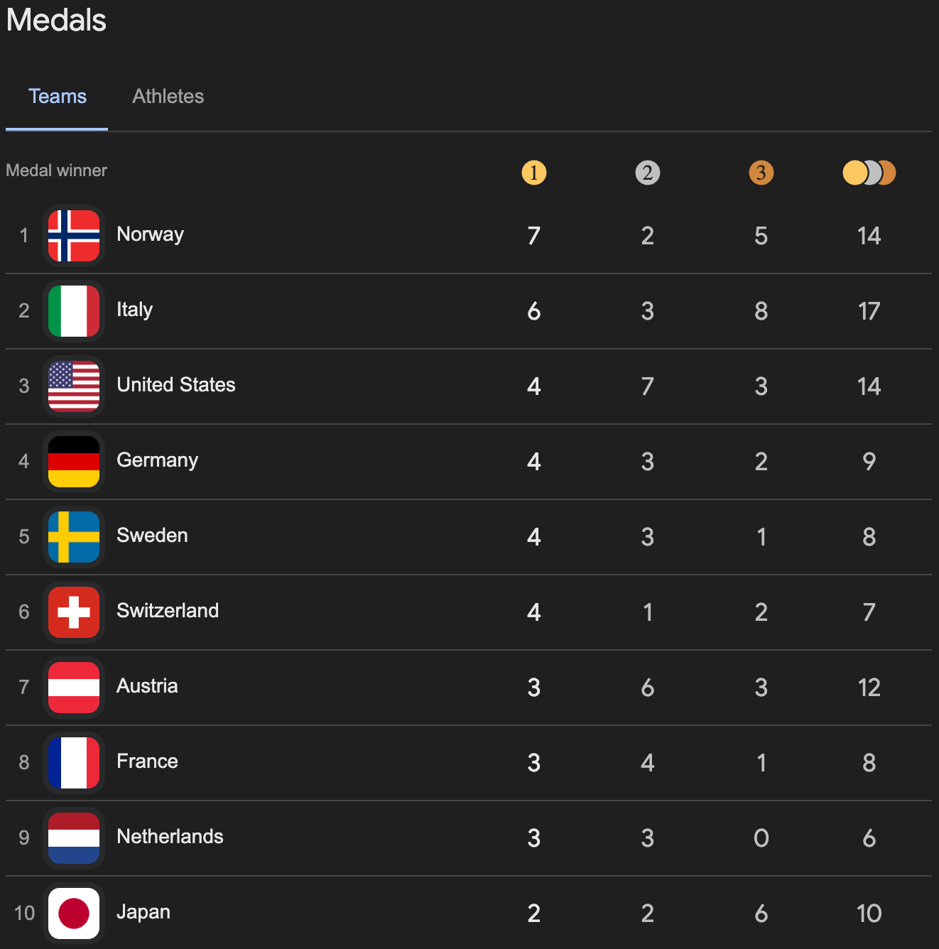 Norway is still ahead, but our Day 3 coverage of the Winter Olympic Games market sees Italy gaining ground.