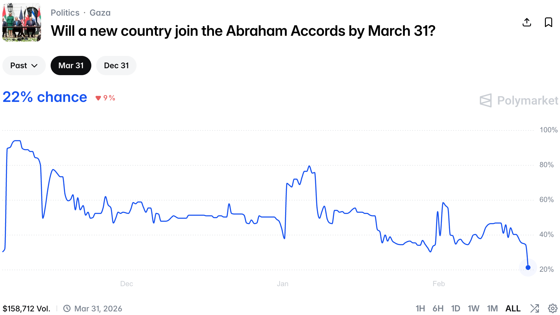 The Abraham Accords market has been in a steady decline ever since the first signs of protest in Iran, but only now the Yes price took such a violent hit.