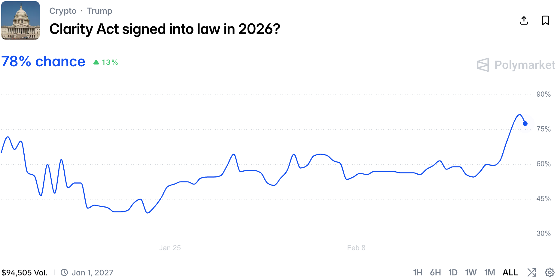 A topic close to our hearts, the market now thinks there is 78% chance the Clarity Act will be signed into law this year.
