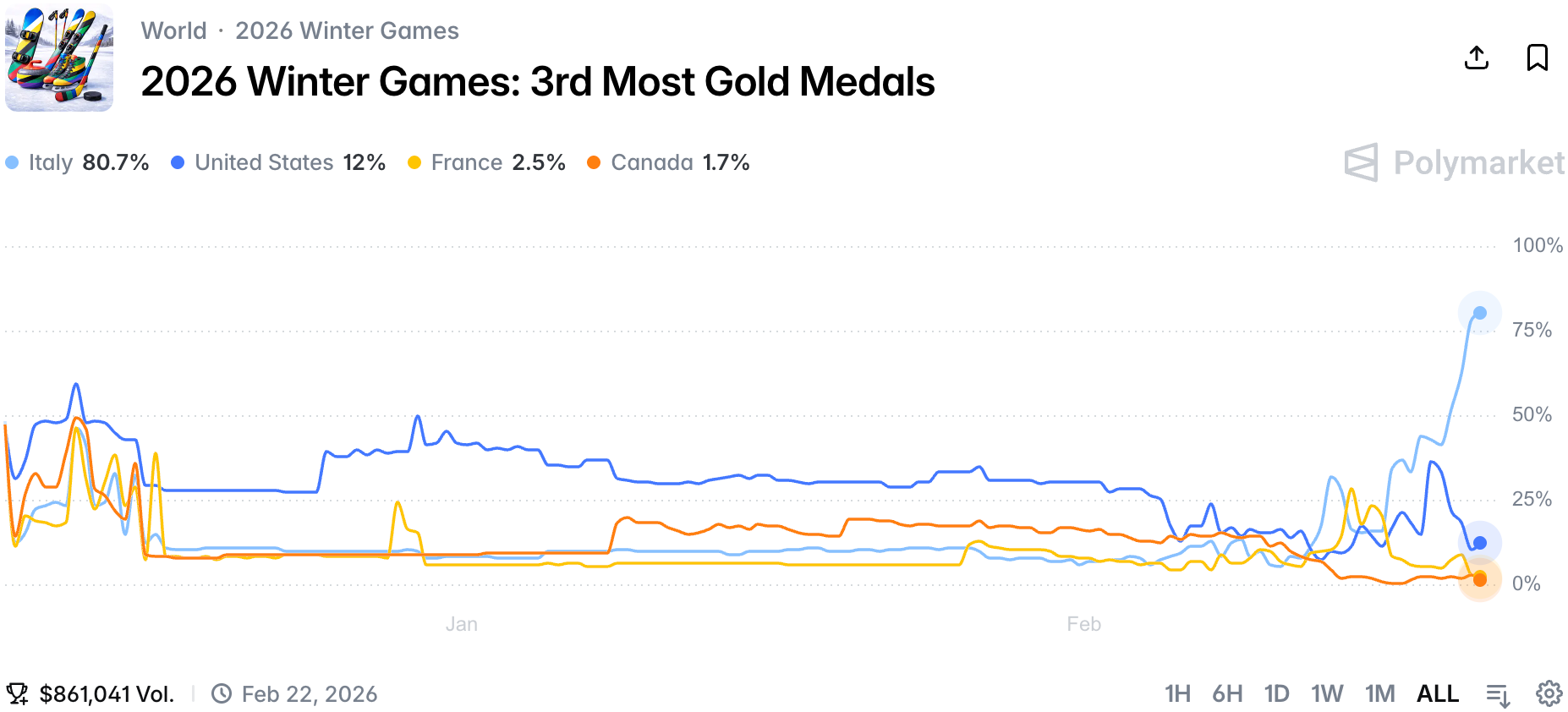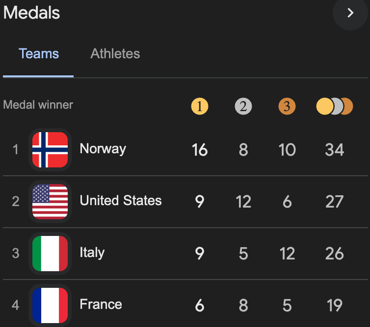 Lastly, as we approach the end of the Winter Olympics, the gold medal podium looks set: Norway, USA and Italy, which breached 80% chance it ends up in the third place.