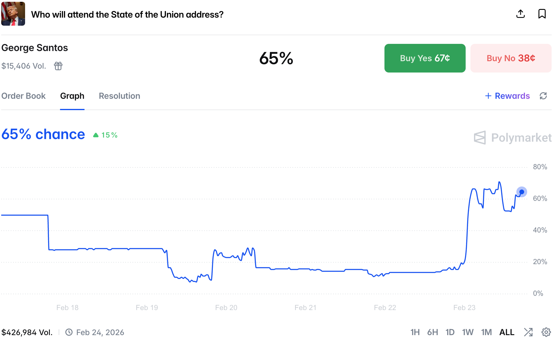 We expect the peak frenzy to hit tomorrow, but in the meantime we already have interesting movements in the "Who will attend SOTU" market, where George Santos's own X post fueled speculation that despite being banned from Congress, he might attend the speech.