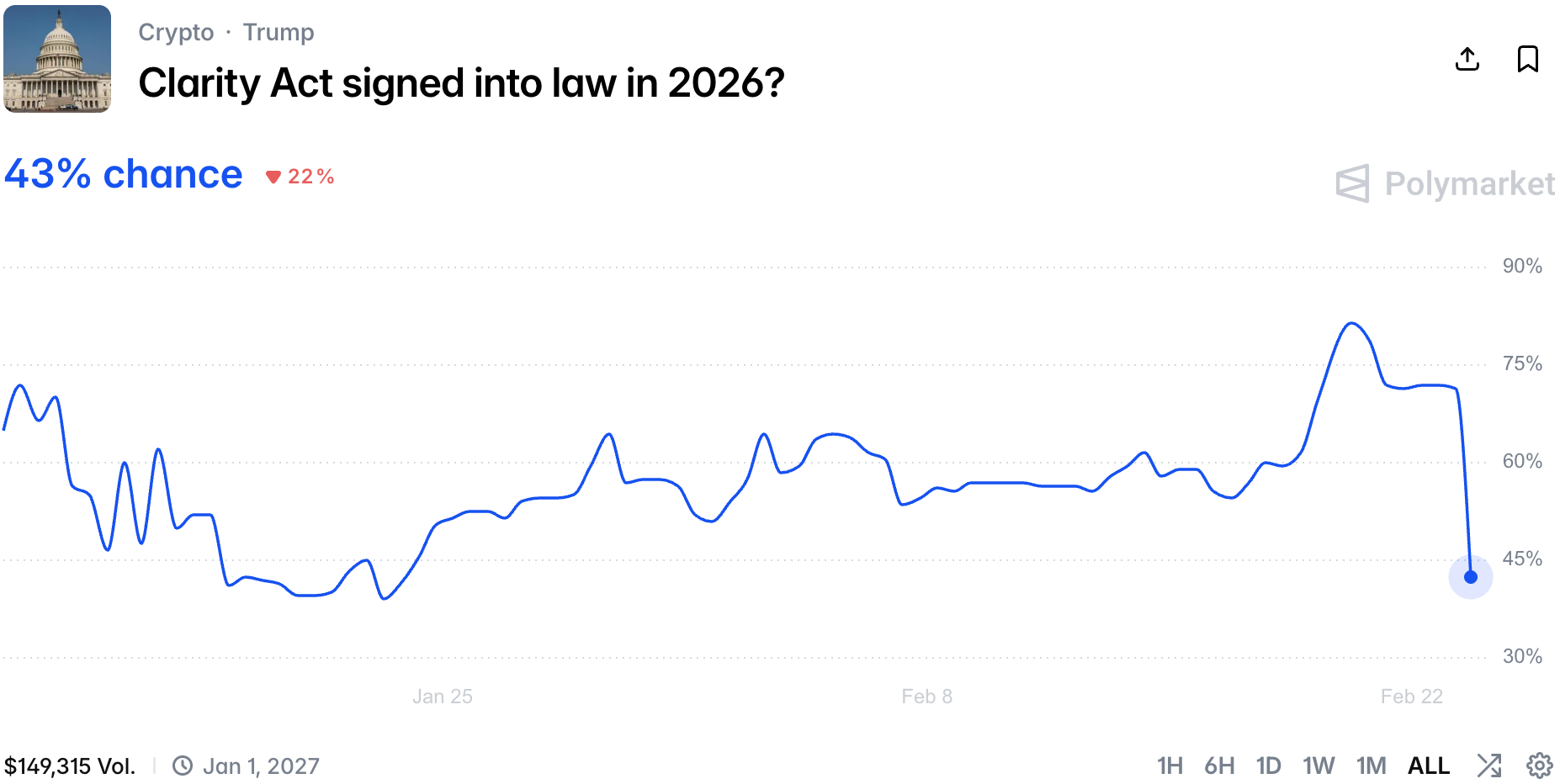 After Ripple CEO expressed his optimism for the Clarity Act to pass, the chances on Polymarket sharply dropped, from 80% down to 43%.