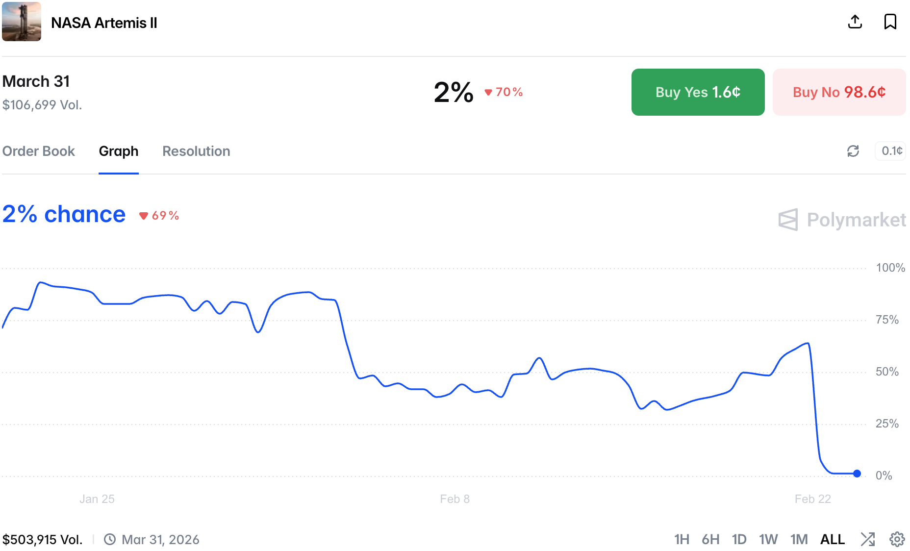 Artemis II was supposed to launch in February, but a failed wet dress rehearsal pushed the date towards March. Now, despite the markets being bullish on end of March deadline, we are looking for April as the next possible month.
