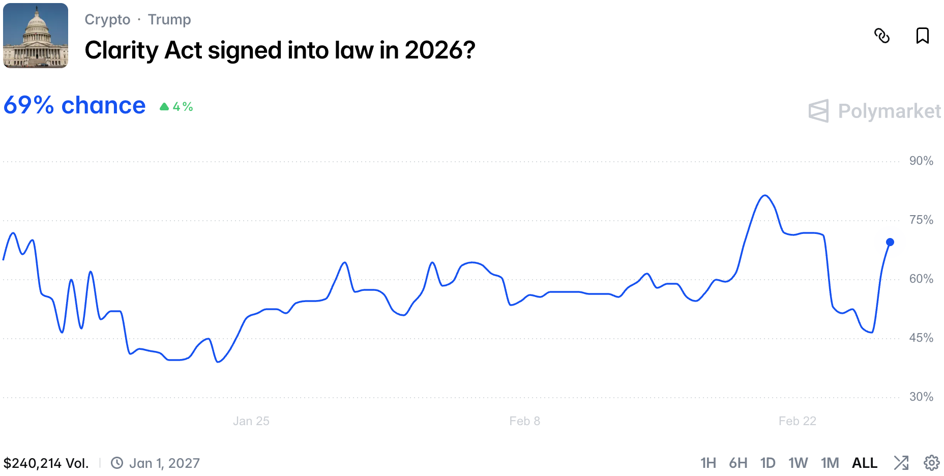 After a massive spike down, the market is once again at 69% chance we will see Clarity Act signed into law this year.