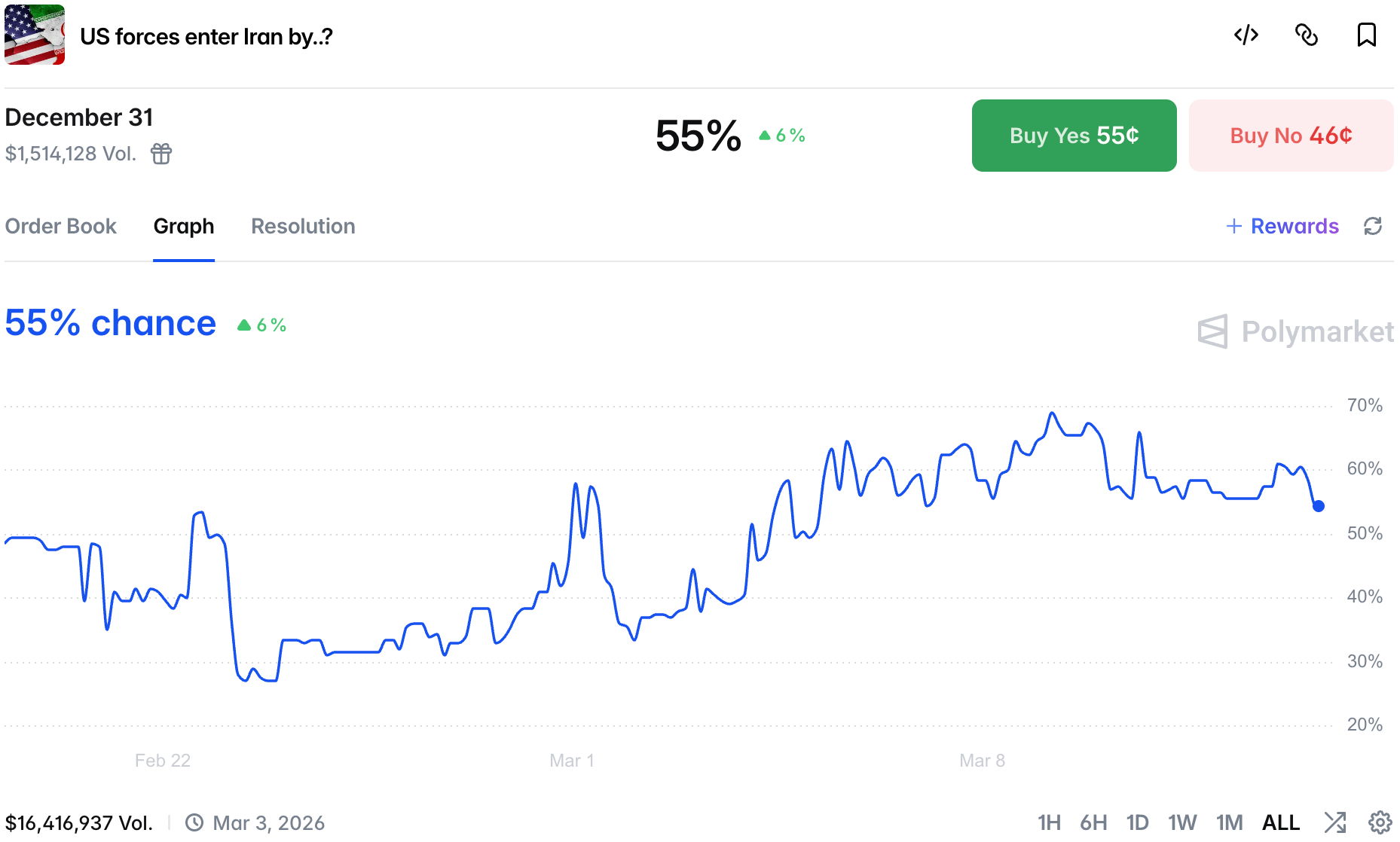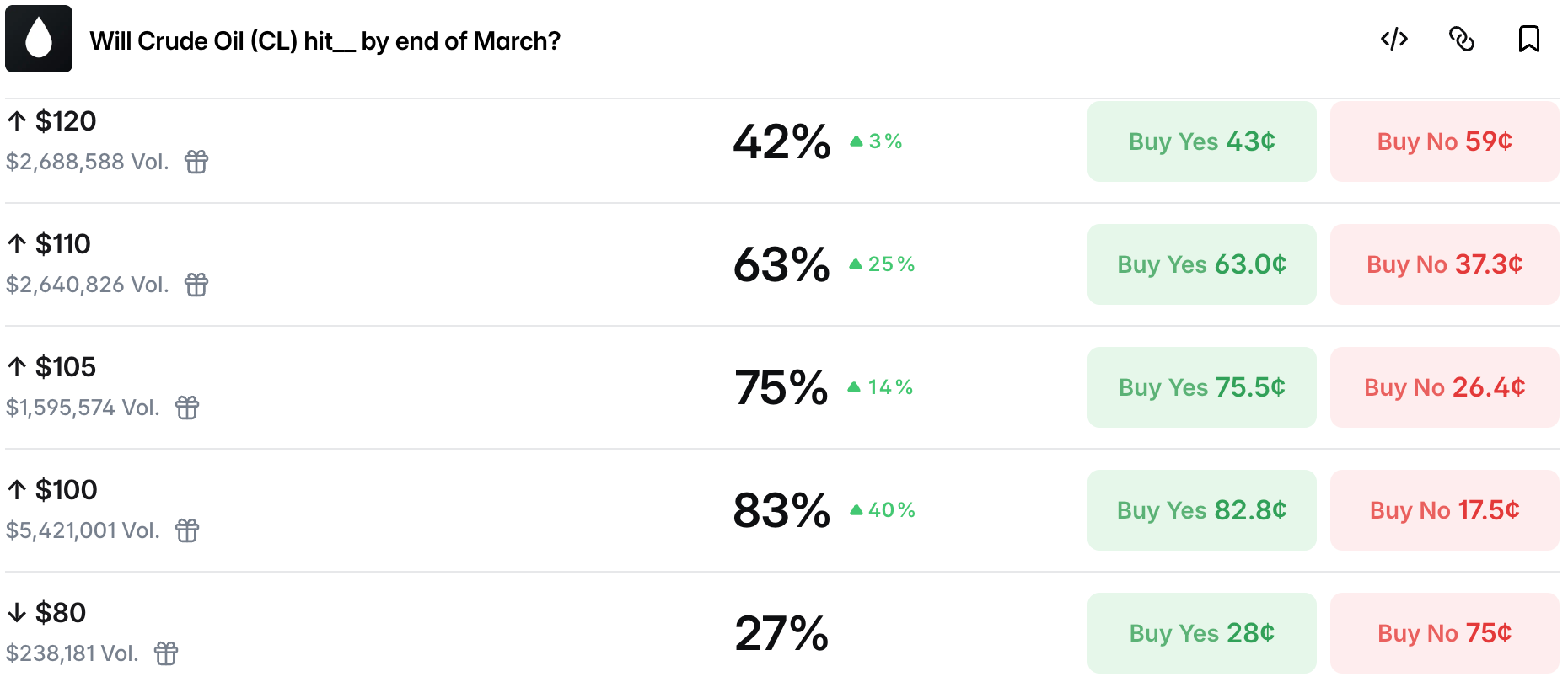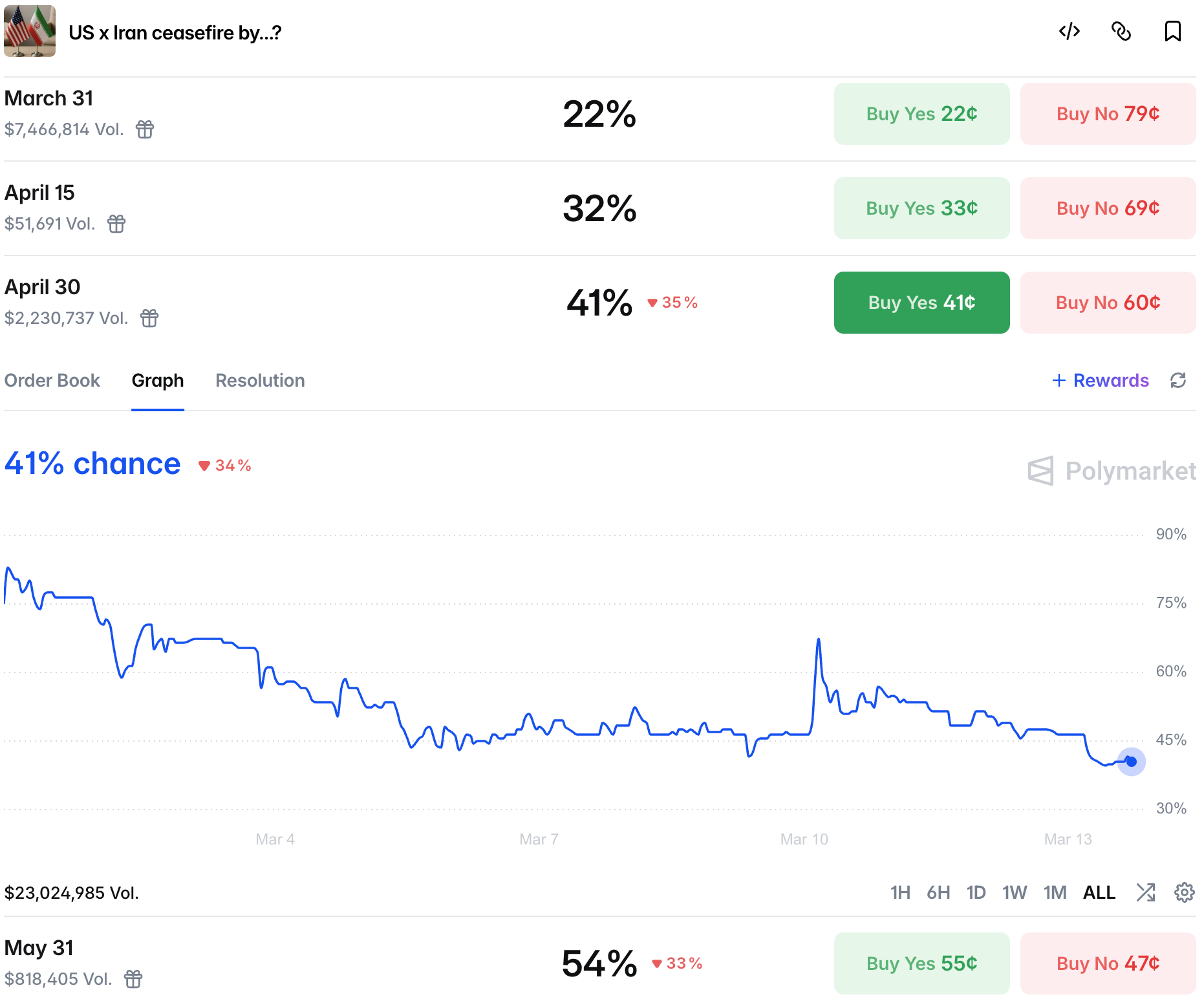 Ceasefire Yes prices continue to drop across all strikes; the effect of not only theta decay, but also the US sending a clear message that they are looking for a prolonged conflict.