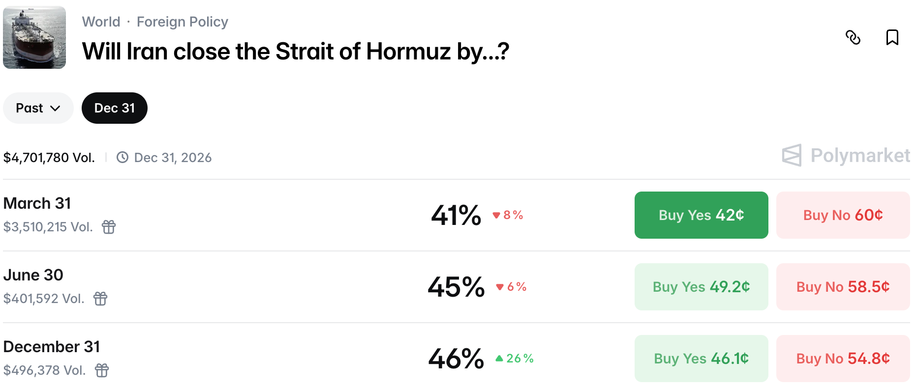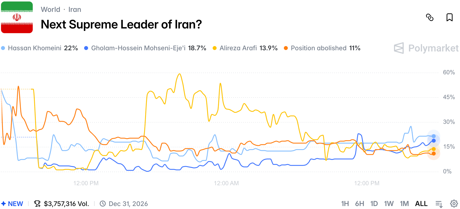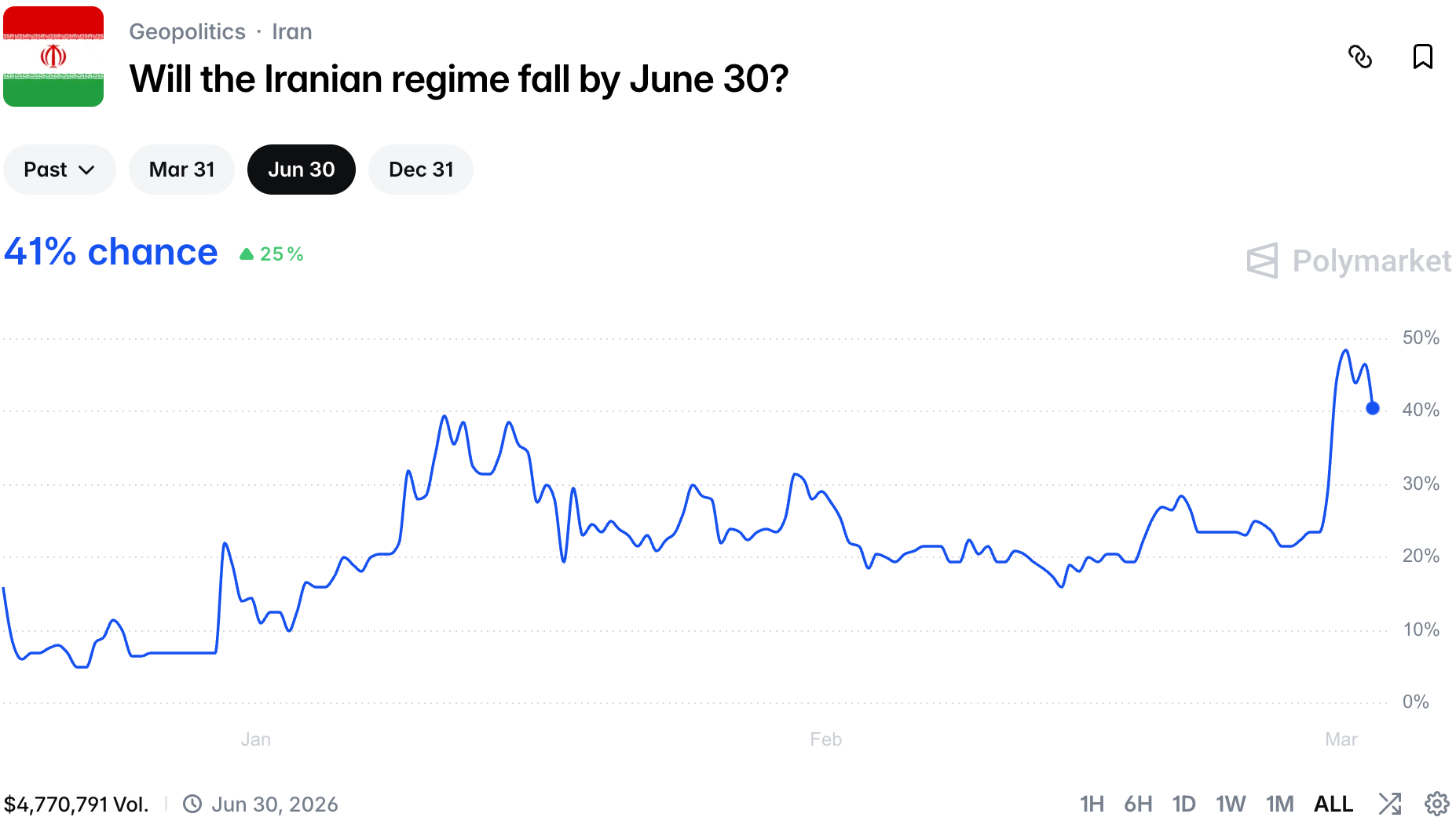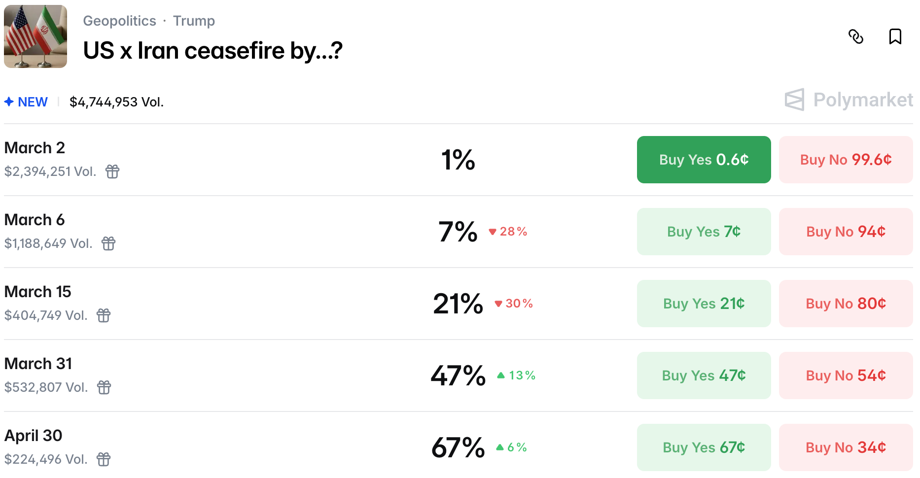 We are abandoning the regular format in order to bring you key information regarding Middle East from prediction markets. While the fog of war is thick, traders are pricing in risk in real time.