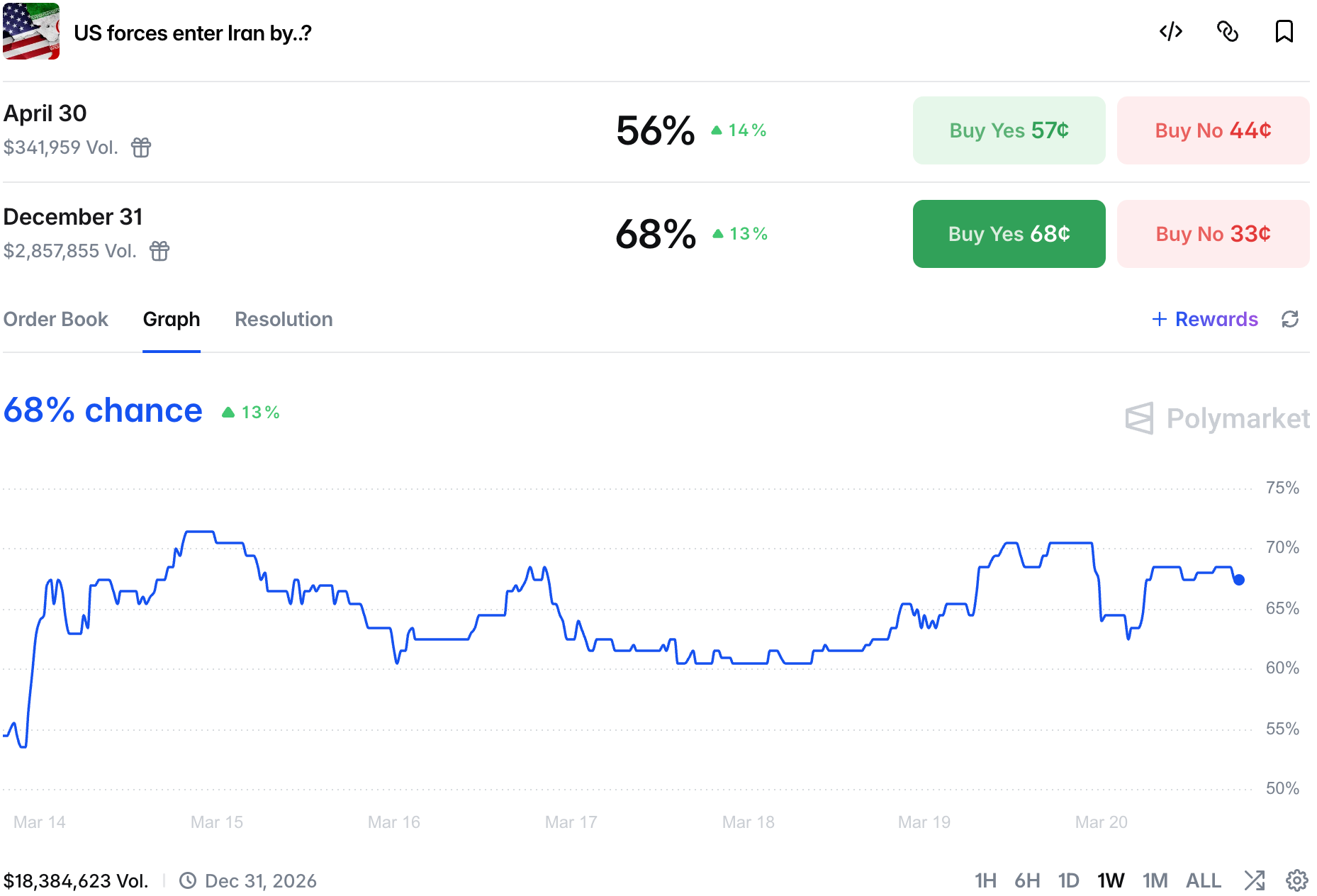 The market on US boots on the ground in Iran rose, indicating 68% chance by the end of the year and 56% chance by the end of April!