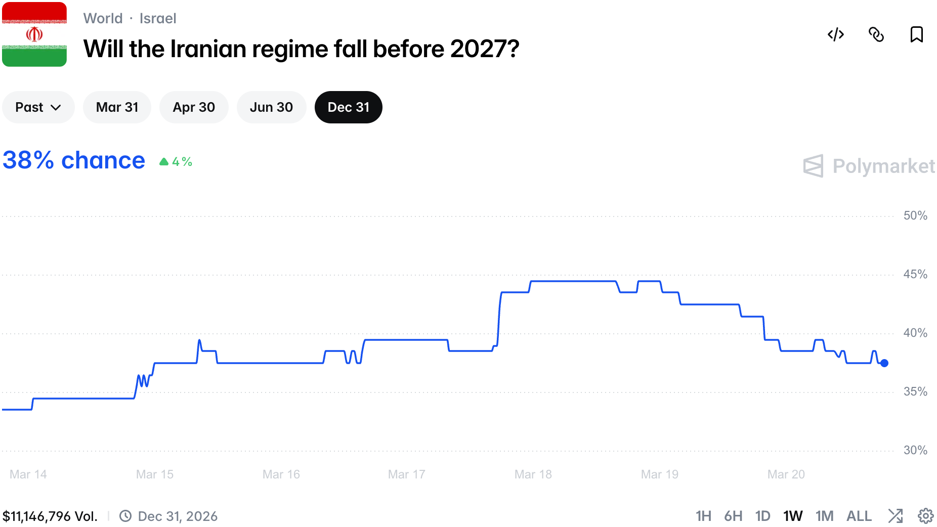 In the meantime the Iranian regime continues to show resilience and chances of its fall dropped to 38%.