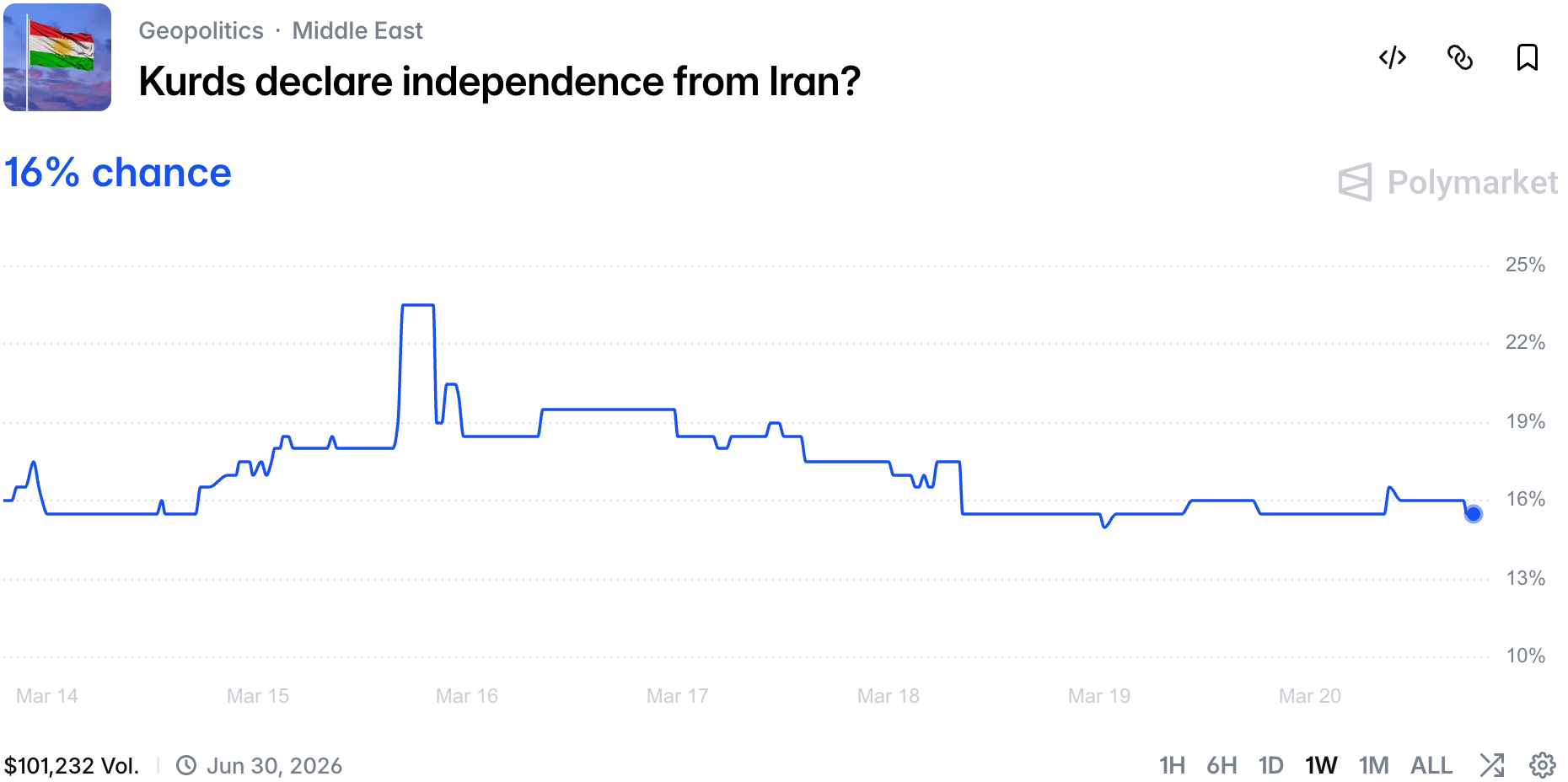 Even amid IRGC spokesman assassination, traders are now fully aware the regime is more than its people, fully institutionalized and in control of the country. The pricing on this market must be in part based on chances of wide military operation on the ground, be it Israelis, Americans or the Kurds: