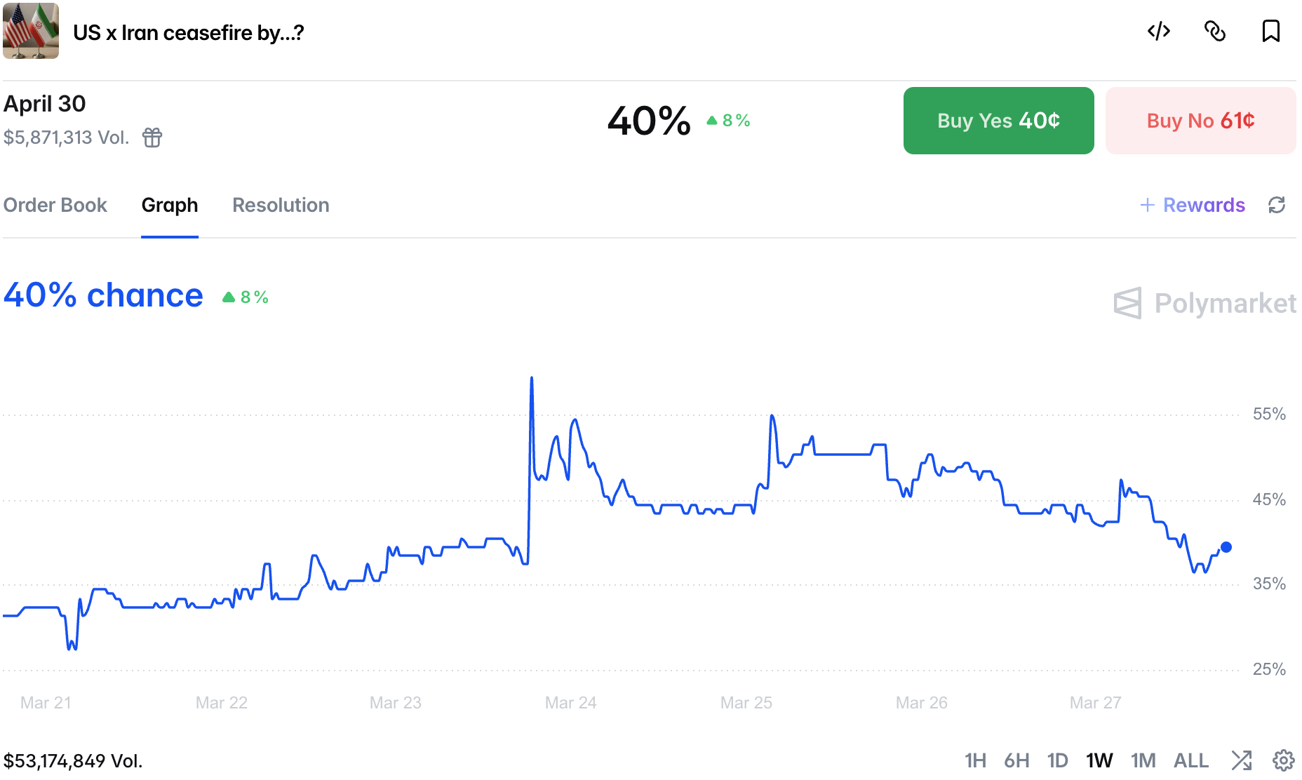 We are entering the weekend with ceasefire chances at 40%, the lowest level since Trump's dovish message on Monday.