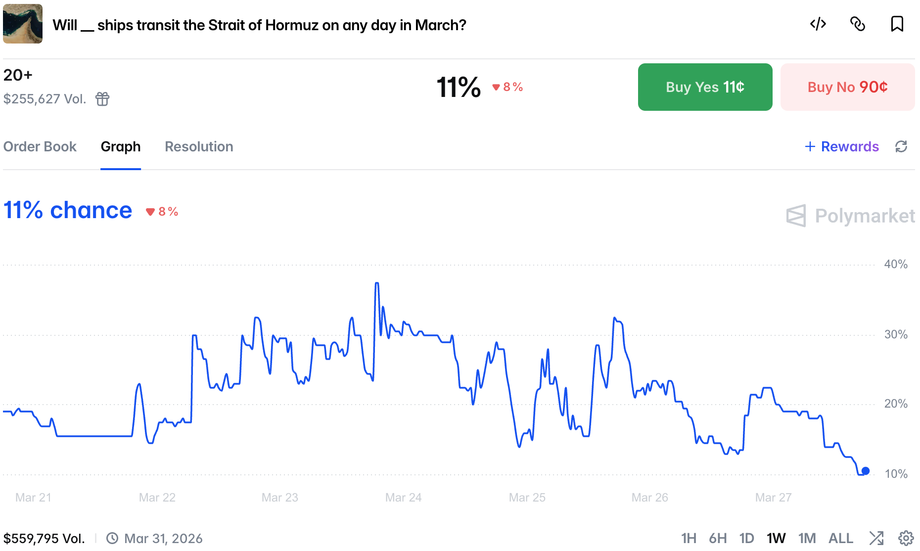 The Strait of Hormuz continues to be effectively closed as chances for 20+ ships to transit the strait in March dropped to the all time low of 11%.