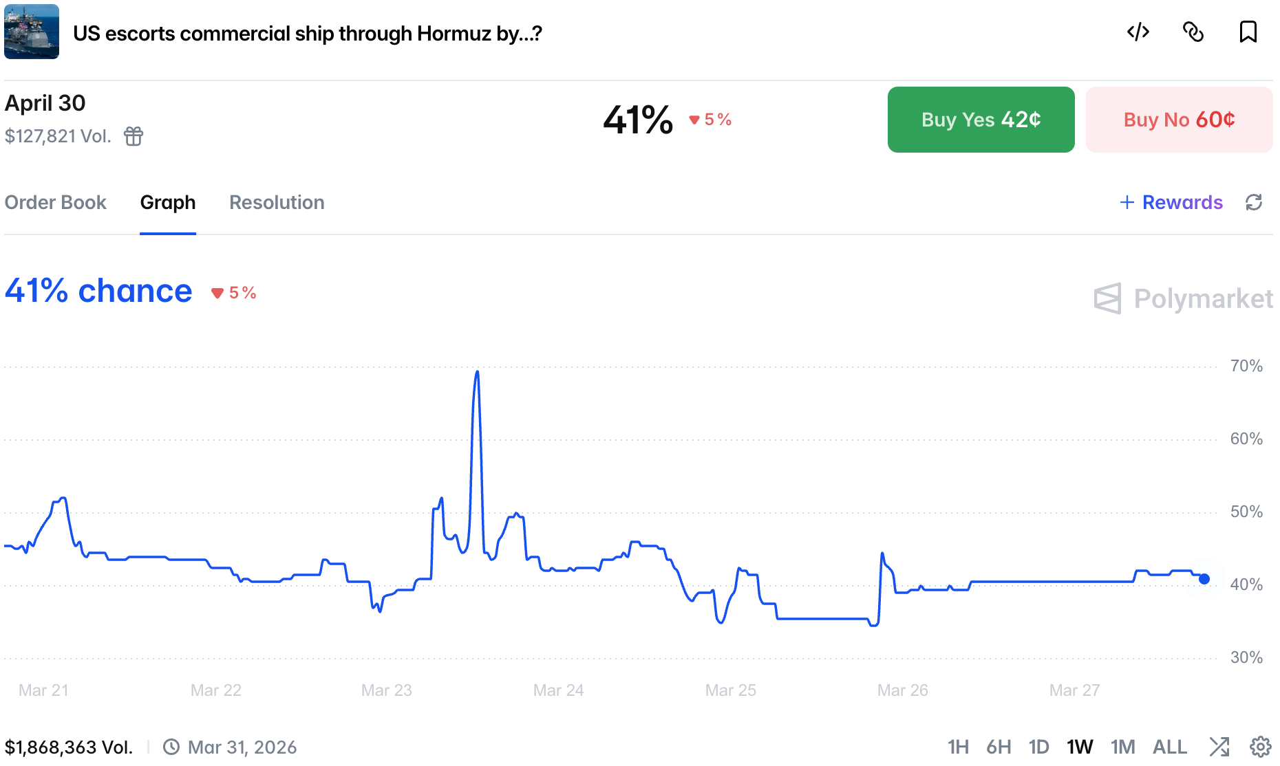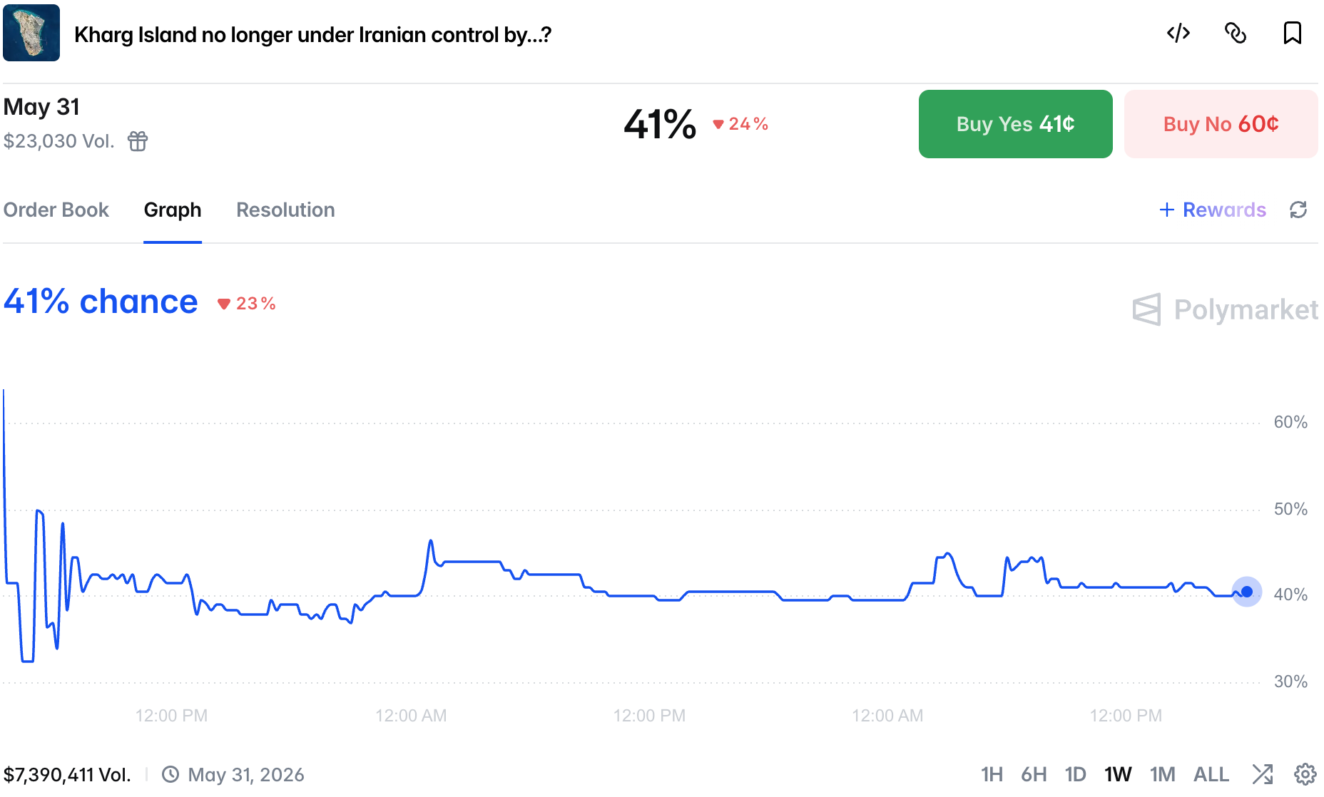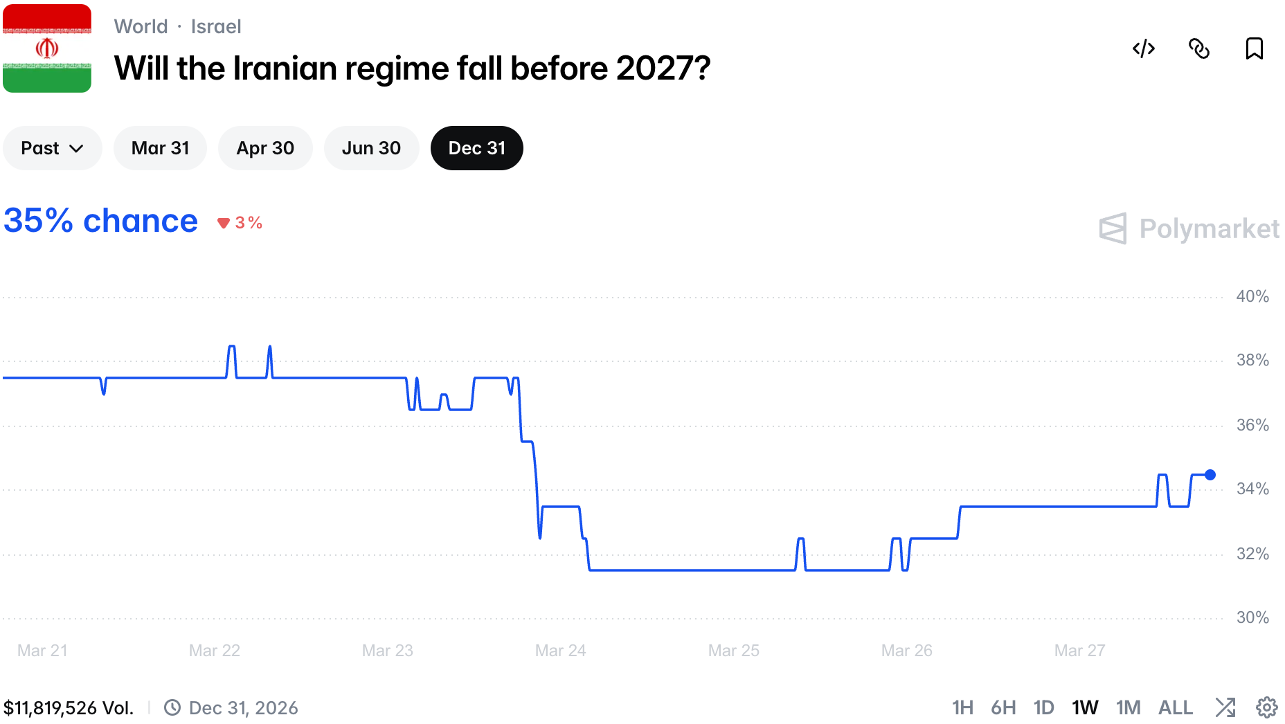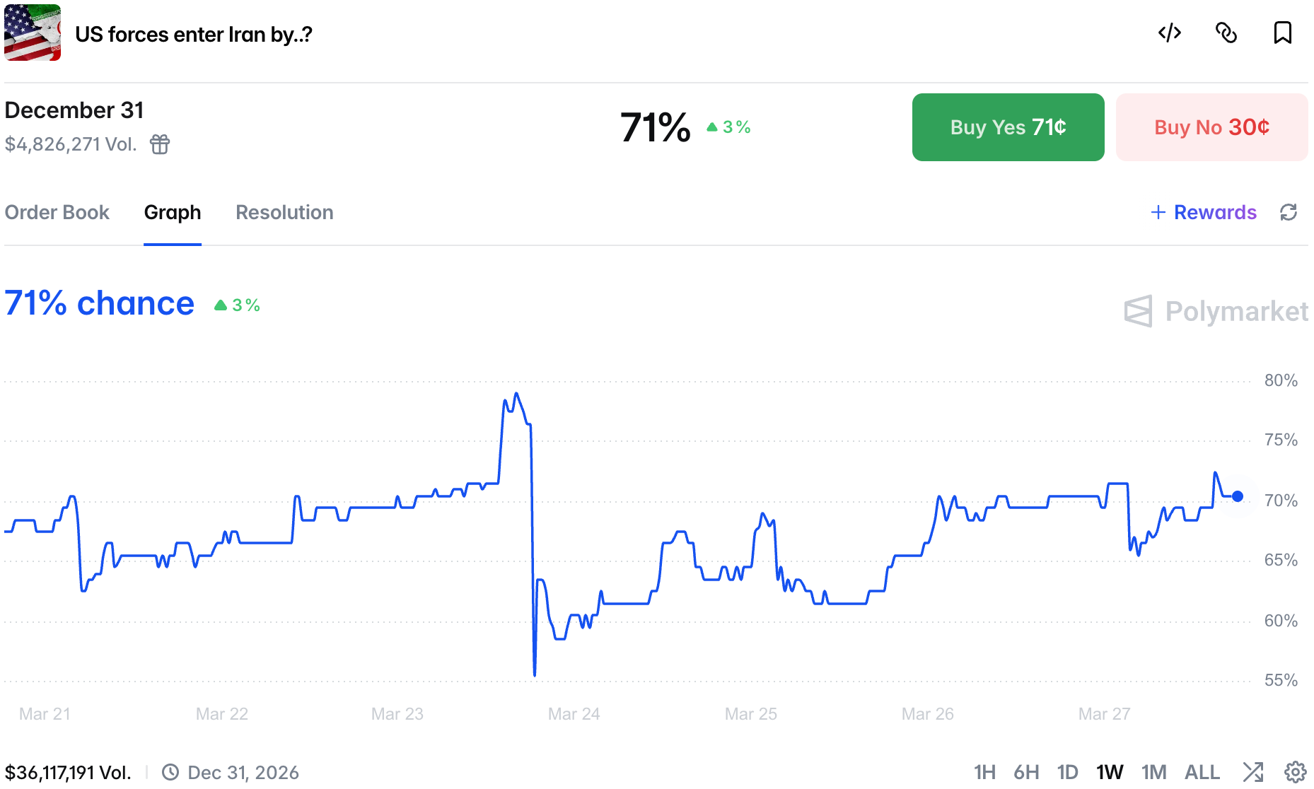 Outside of more soldiers being sent to the region, there are rumors in DC that we might see first boots on the ground this weekend. However, chances are the target might not be Kharg Island, this no change in chances there as the market stayed flat on the news: