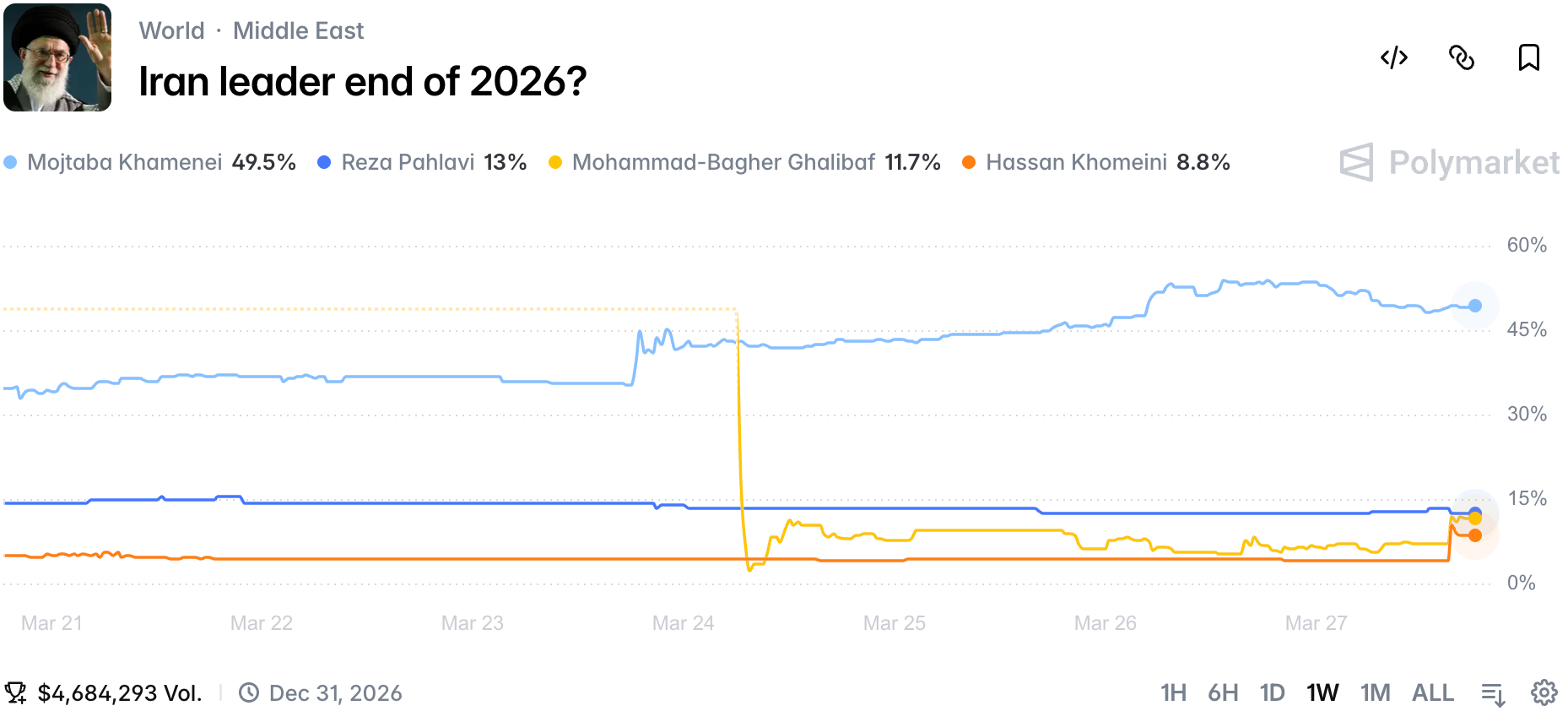 Mojtaba Khamenei's chances for staying in as the Supreme Leader of Iran dropped slightly below 50%.